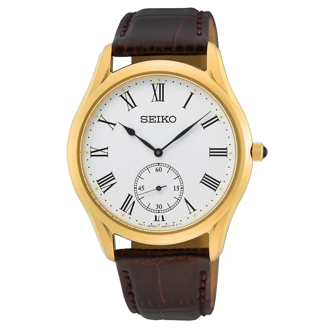 Seiko Classic SRK050P1 to elegancki zegarek męski zaprojektowany w duchu tradycyjnego wzornictwa, w którym dominują czyste linie, klasyczne proporcje i czytelna kompozycja tarczy. Biały cyferblat zdobią wyraziste rzymskie indeksy, a charakterystycznym akcentem modelu jest mały sekundnik umieszczony na godzinie szóstej, nawiązujący do dawnych zegarków kieszonkowych.