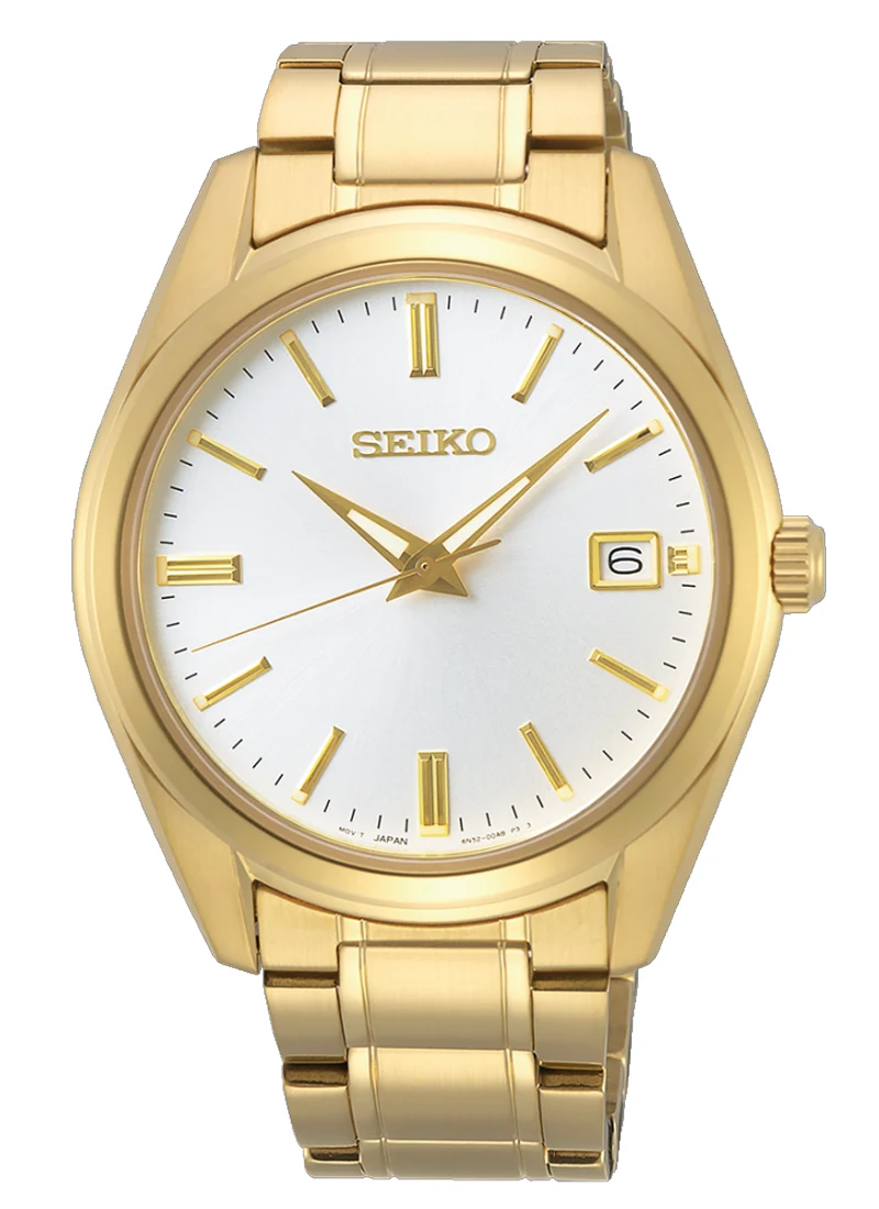 Klasyczny, pozłacany zegarek męski Seiko New Link SUR314P1. Wszechstronny model pasujący zarówno do codziennych, jak i formalnych sytuacji. Jego obudowę tworzy wytrzymała i hipoalergiczna stal szlachetna klasy 316L. Z pięciu rzędów bransolety trzy są wyszczotkowane, a pozostałe wypolerowane, dodając elegancki i kreatywny akcent. Szczotkowanie cechuje także 40-milimetrową kopertę, z kolei polerowanie bezel, zachowując konsekwencję w wykończeniu. Wszystkie złote powierzchnie są wypolerowane i naniesione metodą powlekania powierzchni PVD.