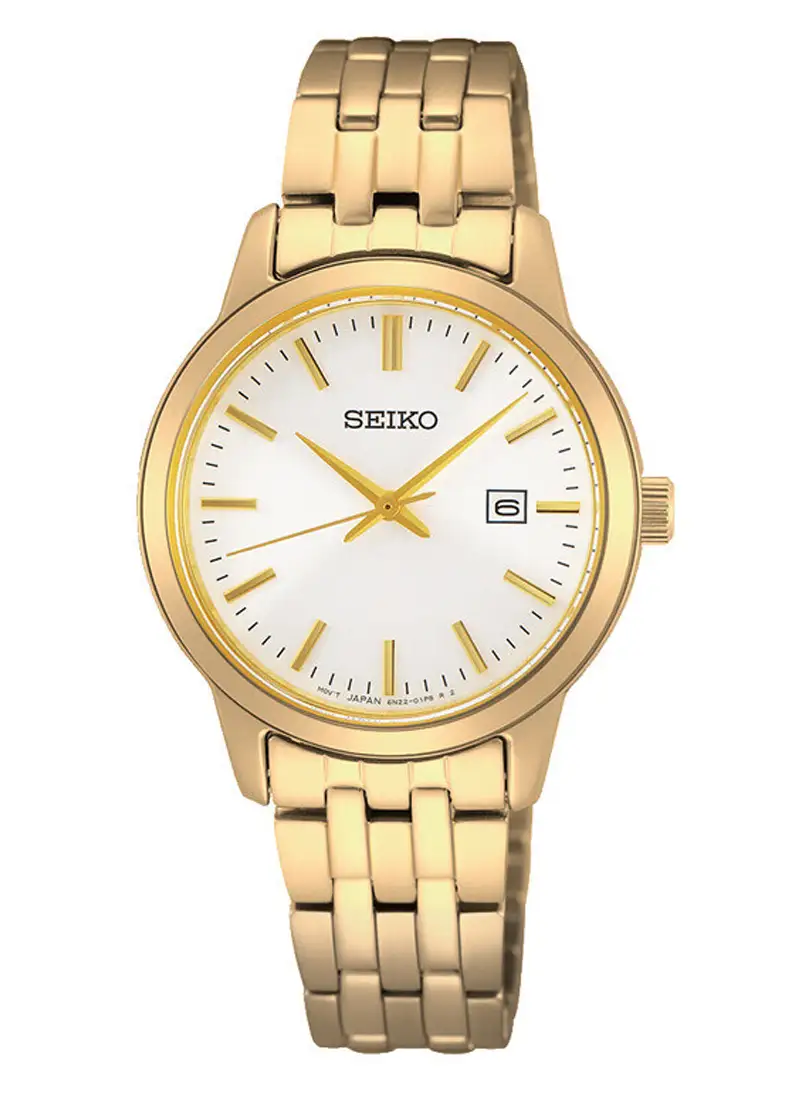 Seiko Classic SUR412P1 to elegancki damski model utrzymany w pełnym złocie. Czysta tarcza i złote detale tworzą ponadczasowy charakter zegarka. To wybór idealny do codziennych i formalnych stylizacji.