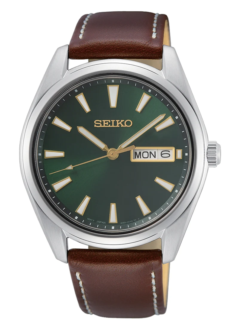 Seiko Classic SUR449P1 to zegarek, który łączy elegancką paletę barw z funkcjonalnością tworzącą komfortowy model do codziennego noszenia. Zielona tarcza o wyrazistym efekcie słonecznego szlifu harmonizuje ze złotymi indeksami i wskazówkami, podkreślając subtelnie klasyczny charakter tego czasomierza. Brązowy skórzany pasek dodaje całości naturalnej lekkości i nadaje bardziej casualowego wyrazu.