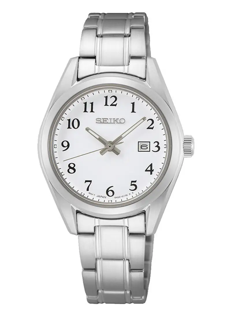 Seiko Classic SUR465P1 to damski zegarek o wyjątkowej czytelności i klasycznym stylu. Biała tarcza, arabskie cyfry i stalowa bransoleta tworzą elegancki, codzienny dodatek.