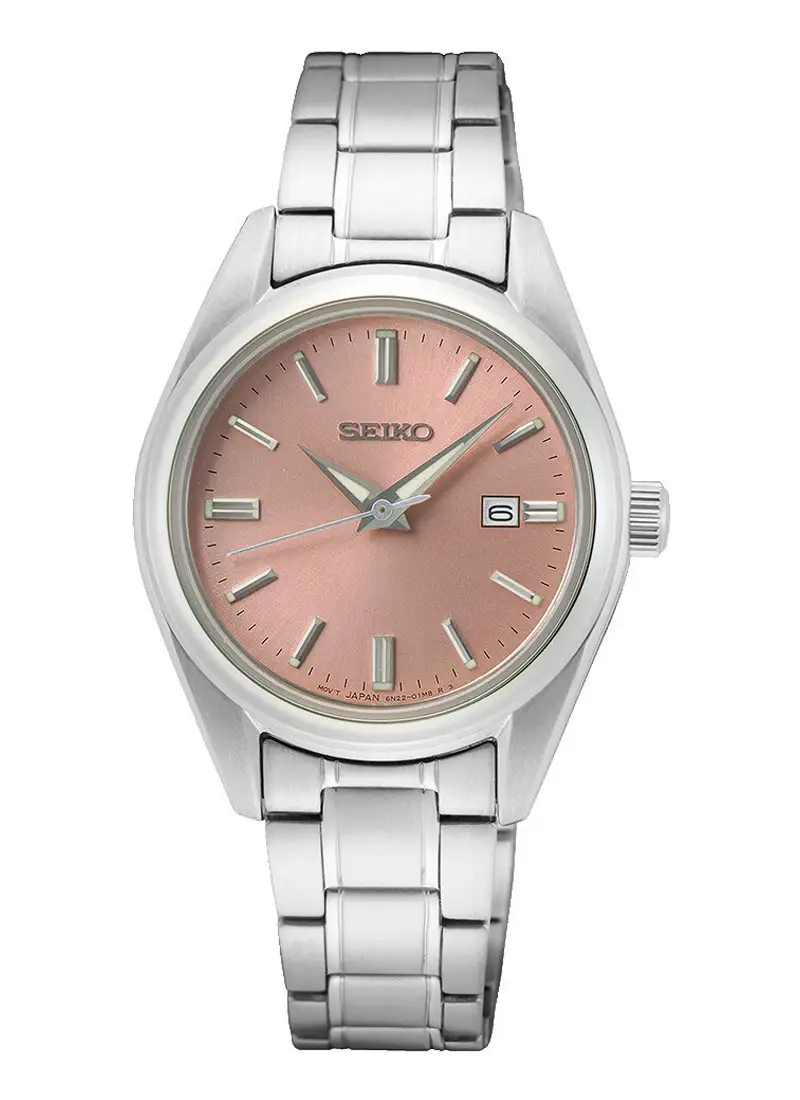 Zegarek damski Seiko Classic SUR529P1 to delikatna i codzienna propozycja, w której klasyczna forma spotyka się z modnym kolorem tarczy o subtelnym różanym odcieniu.