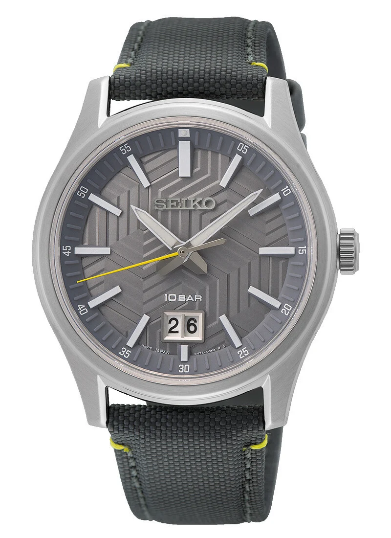 Męski zegarek Seiko z dużym datownikiem. Stalowa koperta o wielkości 40 mm uszczelniona do 100 metrów. Gumowy pasek w kolorze szarym. Mechanizm kwarcowy zasilany baterią. Odporność magnetyczna do 4800 A/m.
