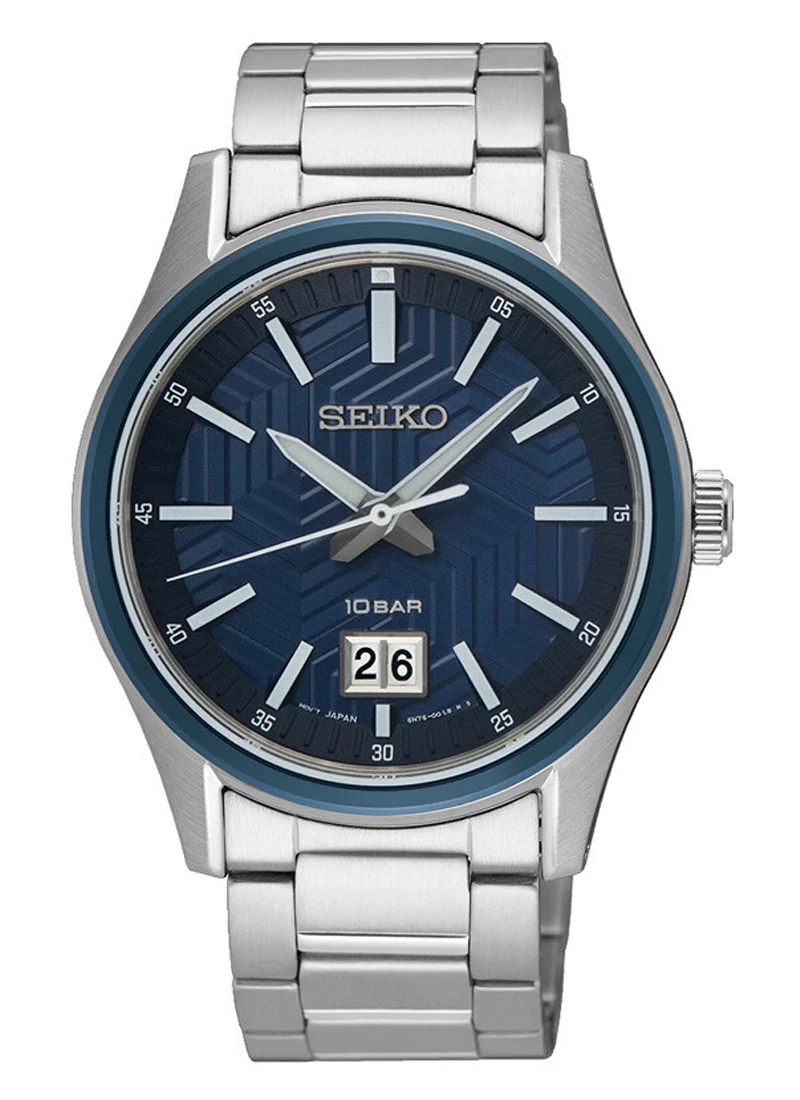 Od frontu zegarek męski Seiko przykryty został odpornym na zarysowania szkłem szafirowym. Osłania ono niebieską tarczę z eleganckimi indeksami, jak i wskazówkami. Producent ułatwił odczytanie godziny w słabym oświetleniu. Wskazówki wypełnione zostały świecącą masą LumiBrite. Funkcjonalność tego modelu zwiększa powiększony datownik na godzinie szóstej. Duże okno wskazuje aktualny dzień miesiąca. Projekt tarczy umożliwia odczytanie już po pierwszym spojrzeniu. Prezentowany model to również doskonała propozycja dla fanów sportów wodnych. Jego wodoszczelność do 100 metrów pozwala właścicielowi pływać z zegarkiem na nadgarstku bez obawy o jego uszkodzenie. Zegarek Seiko na bransolecie to doskonała propozycja czasomierza na każdą okazję.