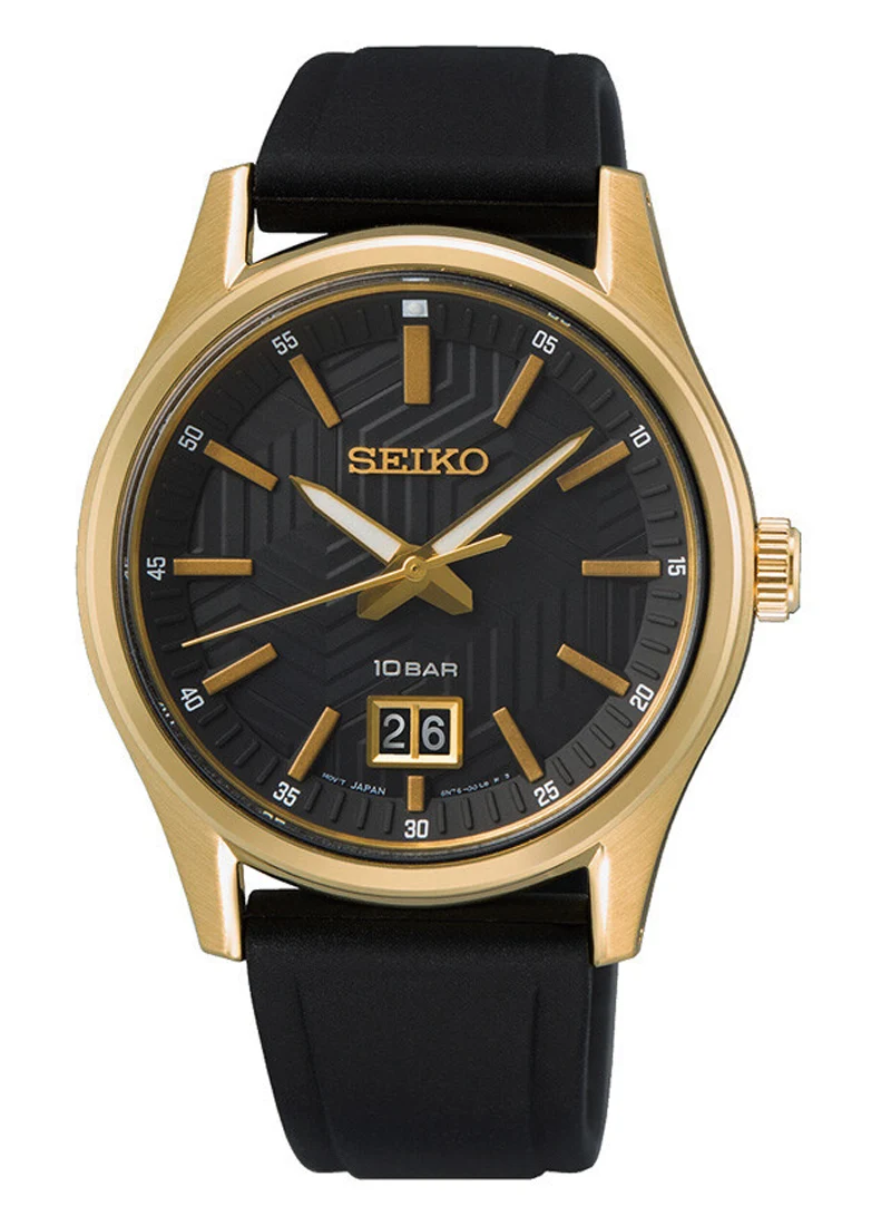 Pozłacany zegarek męski Seiko Classic na pasku gumowym. Japoński mechanizm z komplikacją datownika Big Date. Czarną tarczę osłania odporne na zarysowania szkło szafirowe.