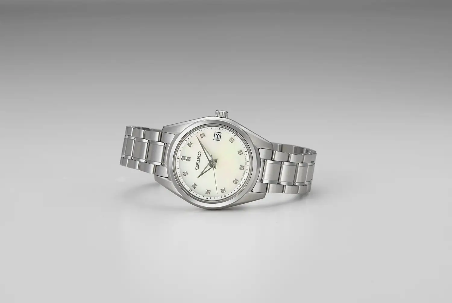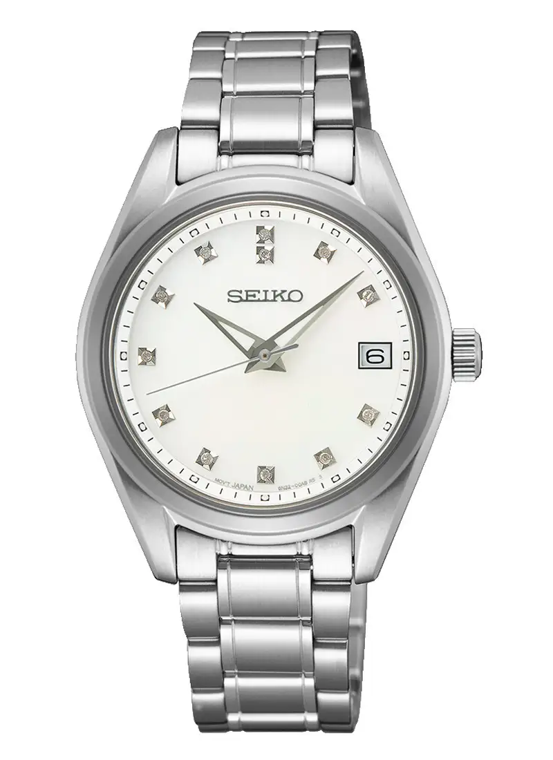 Model wyróżnia się obecnością aż 12 naturalnych diamentów, osadzonych jako indeksy godzinowe, co wprowadza do projektu biżuteryjną precyzję i wyjątkowy charakter. Stalowa koperta o średnicy 32 mm jest odporna na zarysowania dzięki szkłu szafirowemu, a wodoszczelność 100 m zapewnia bezpieczne użytkowanie na co dzień. Mechaniczna solidność marki Seiko jest tu połączona z estetyką, która podkreśla styl każdej stylizacji – od codziennej po wieczorową.
