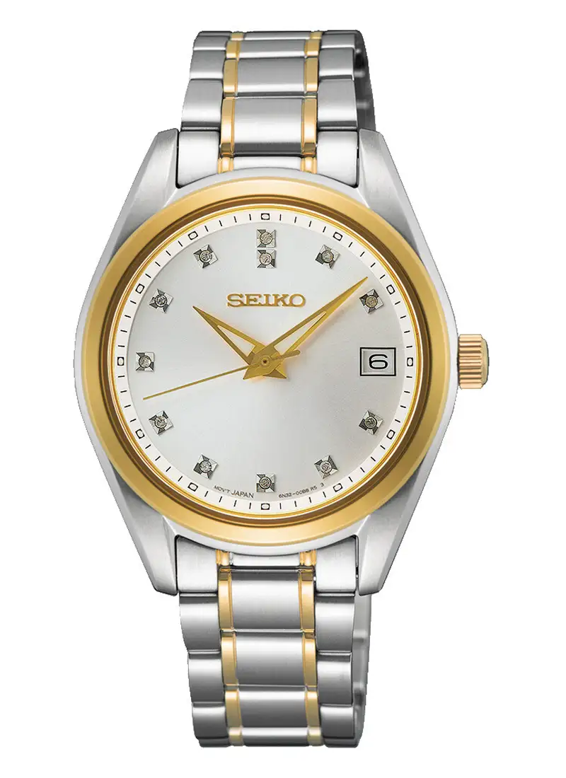 Seiko Classic SUR582P1 wyróżnia się srebrną tarczą ze szlifem słonecznym i 12 diamentami. Dwukolorowa bransoleta nadaje mu eleganckiego charakteru. Idealny dla kobiet ceniących klasyczny styl.
