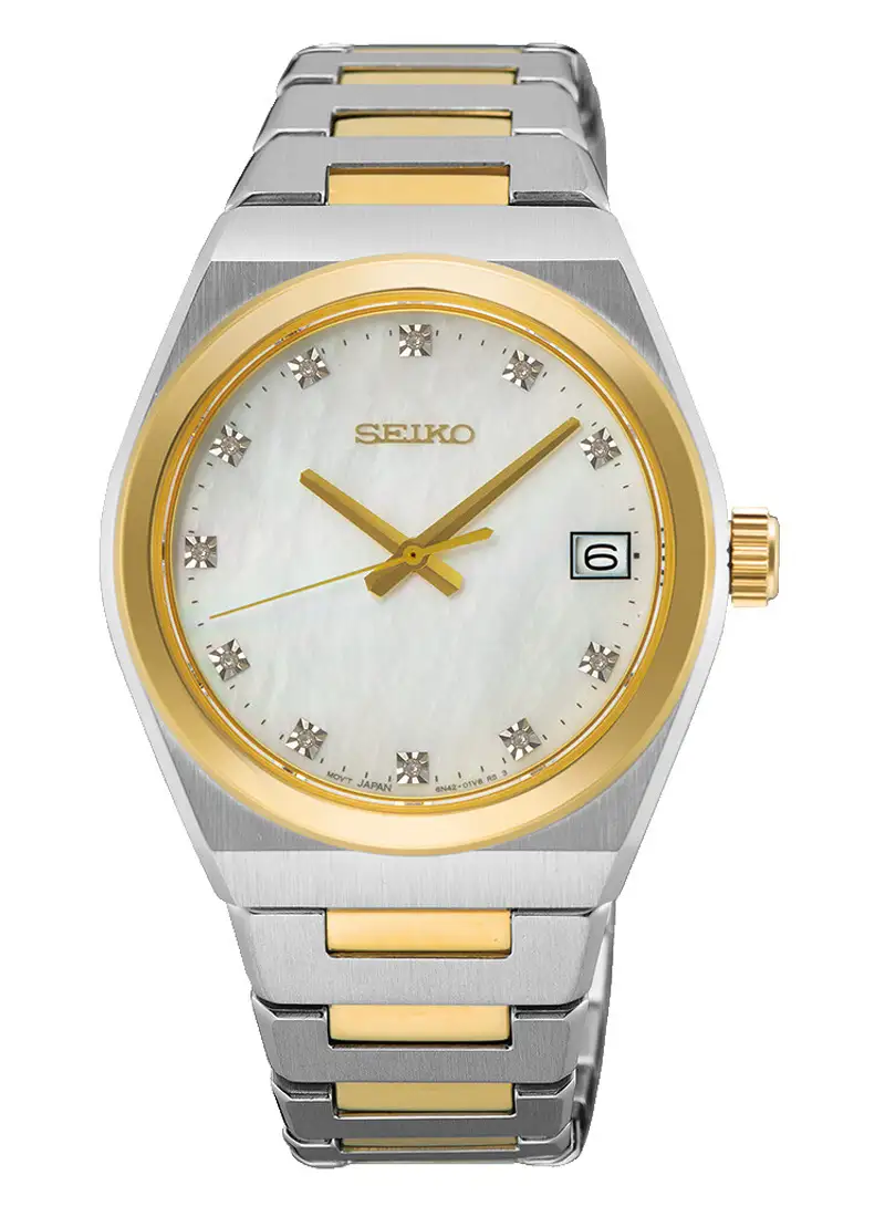 Seiko Classic SUR604P1 zachwyca tarczą z masy perłowej i diamentowymi indeksami. Złocone akcenty dodają elegancji. To idealny wybór dla kobiet ceniących subtelny luksus.