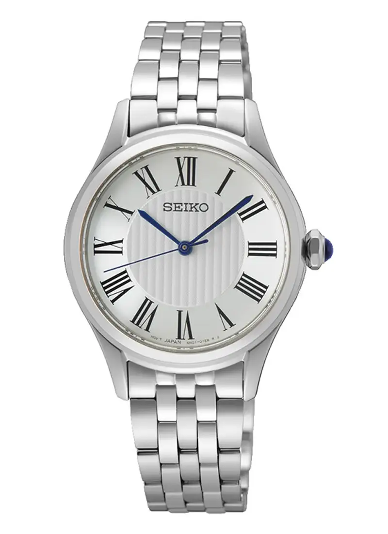 Seiko Classic SUR609P1 to elegancki zegarek damski, który łączy klasyczną estetykę z biżuteryjną subtelnością. Biała tarcza z pionowym wzorem przyciąga uwagę dzięki wyraźnym rzymskim indeksom oraz delikatnym, niebieskim wskazówkom nadającym kompozycji lekkości. Charakterystycznym akcentem modelu jest ozdobna koronka z niebieskim cabochonem, podkreślająca jego wysmakowany styl.
