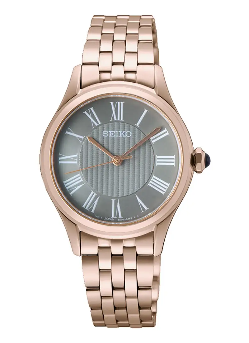 Seiko Classic SUR614P1 to elegancki damski zegarek, który łączy klasyczny styl z wyrafinowaną estetyką różowego złota. Model zachwyca biżuteryjnym charakterem – od smukłej koperty, przez pełną subtelnych refleksów bransoletę, po harmonijnie zakomponowaną tarczę.
