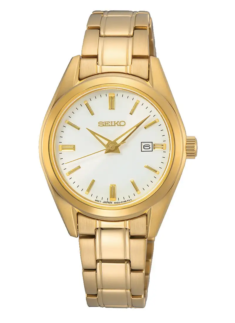 Seiko SUR632P1 to propozycja dla kobiet szukających eleganckiego zegarka o ciepłej, złotej estetyce, który spełni funkcję stylowej biżuterii, a jednocześnie pozostanie niezawodnym dodatkiem na co dzień.