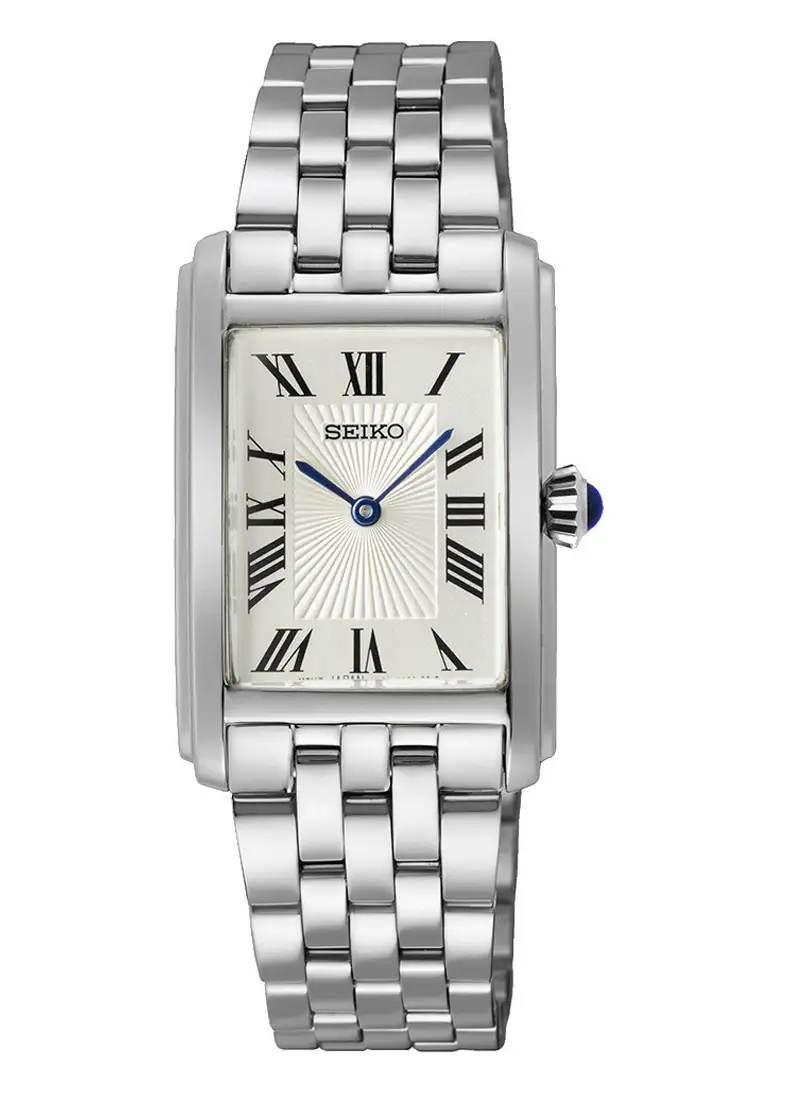 Damski Seiko SWR083P1 z delikatną prostokątną kopertą, stalową bransoletą i elegancką tarczą z rzymskimi indeksami. Klasyczna forma w nowoczesnym wydaniu.