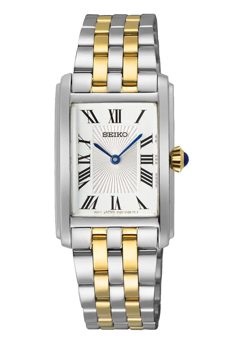 Damski Seiko SWR087P1 w eleganckiej, dwukolorowej odsłonie z prostokątną kopertą i rzymskimi indeksami. Klasyczna forma o subtelnym biżuteryjnym charakterze.