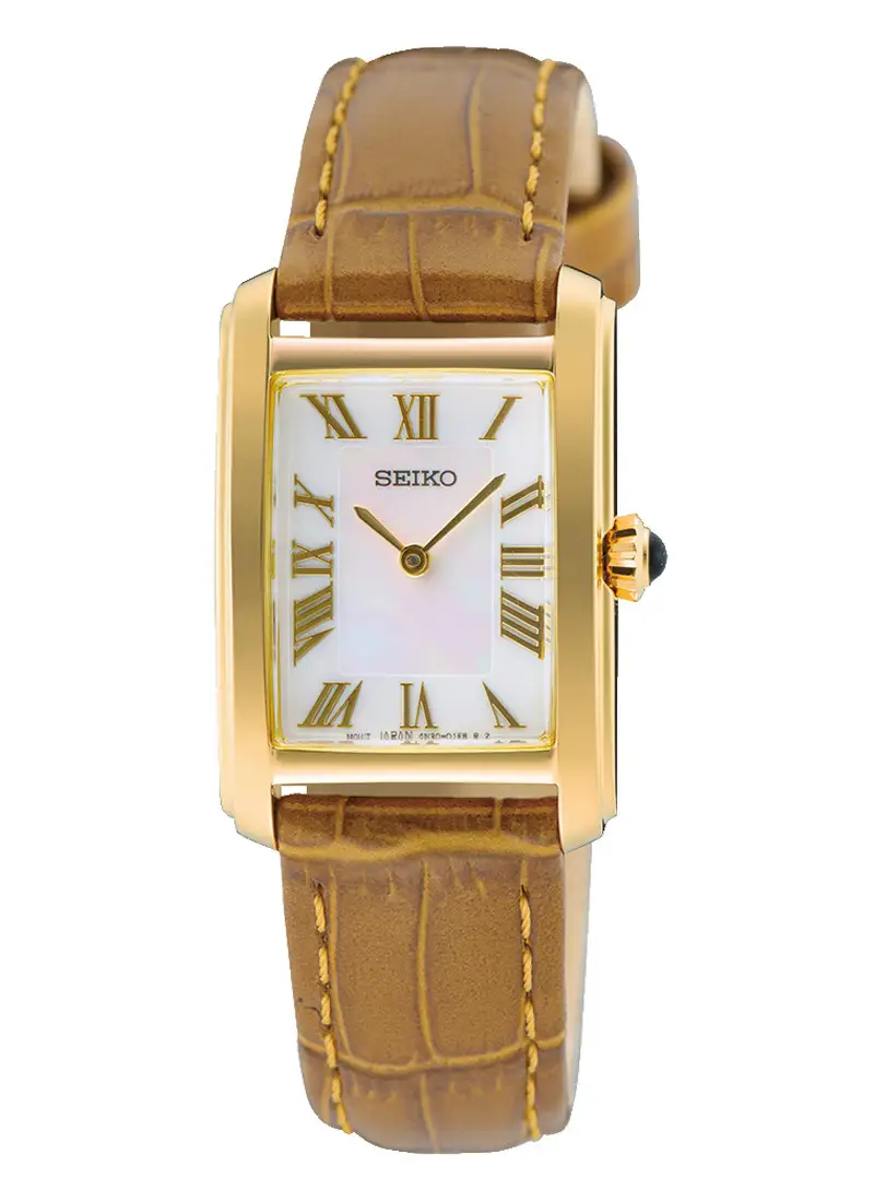 Seiko Classic SWR100P1 to lekki, klasyczny czasomierz, który idealnie układa się na nadgarstku i przyciąga spojrzenia subtelnym połączeniem złotych detali i perłowej tarczy. Doskonały wybór dla Pań poszukujących eleganckiego dodatku utrzymanego w tradycyjnym stylu.