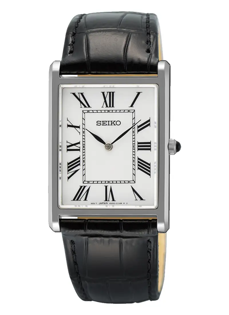 Seiko Classic SWR103P1 to elegancki męski zegarek w prostokątnej kopercie z rzymskimi indeksami. Biała tarcza i skórzany pasek tworzą ponadczasowy duet. Model wyróżnia szkło szafirowe oraz lekka, smukła konstrukcja.