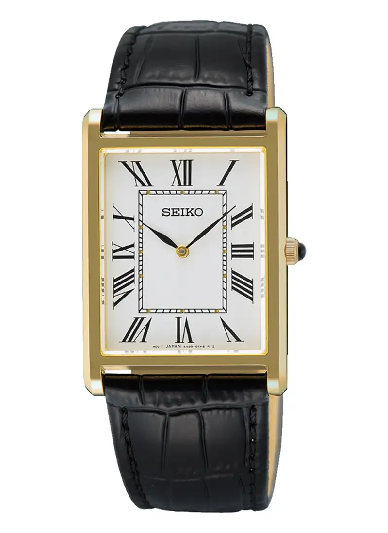 Zegarek męski Seiko Classic SWR104P1 to elegancja w najczystszej formie, wyróżniająca się klasycznym designem i ponadczasową linią prostokątnej koperty. W tej wersji model otrzymał wykończenie w kolorze żółtego złota, które dodaje mu wyrafinowanej, biżuteryjnej prezencji, nadal pozostając wiernym stylistyce tradycyjnych czasomierzy Seiko.