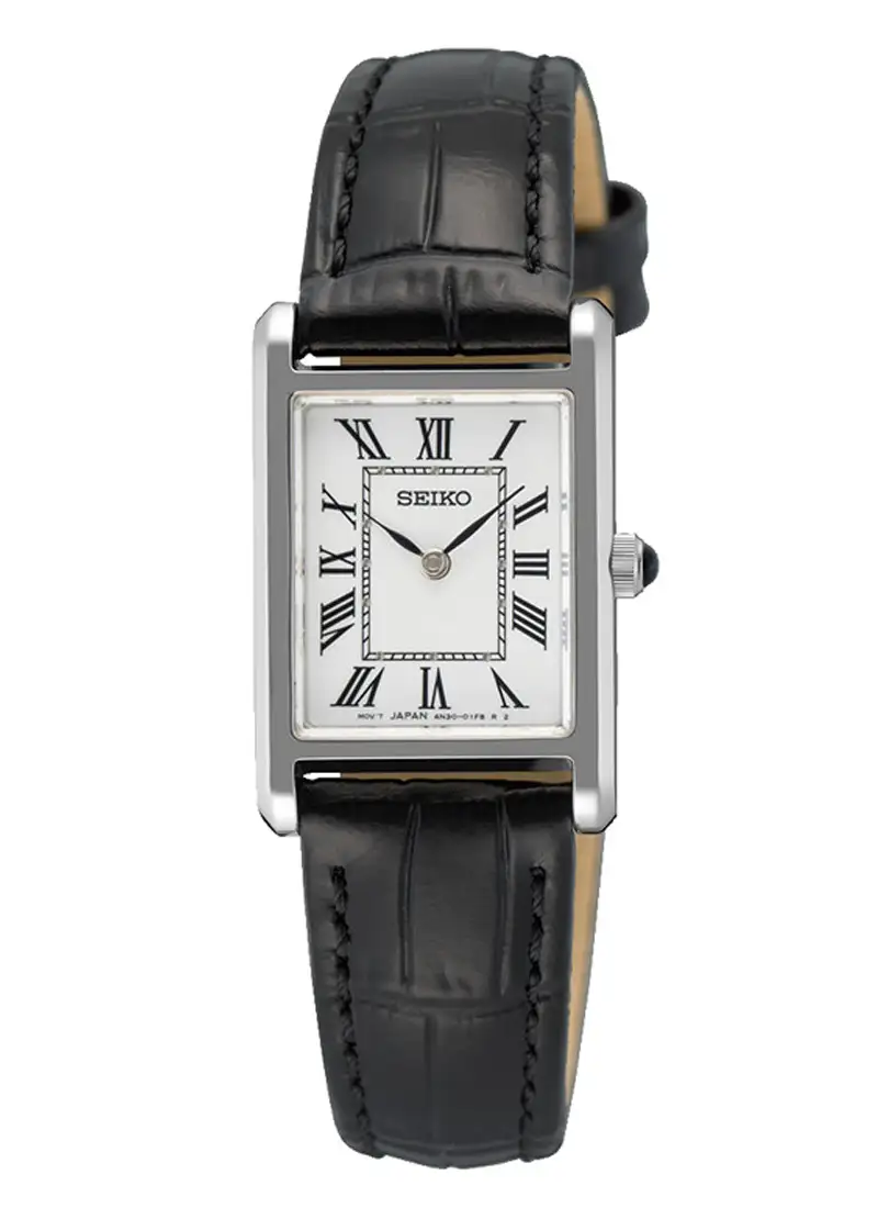 Seiko Classic SWR107P1 to elegancki damski zegarek o smukłej, prostokątnej kopercie. Biała tarcza z rzymskimi indeksami podkreśla jego klasyczny charakter. Model uzupełnia skórzany pasek i wytrzymałe szkło szafirowe.