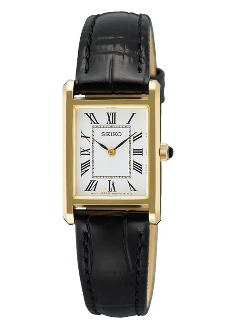 Zegarek damski Seiko Classic SWR108P1 to elegancja w najczystszej formie, wzbogacona o biżuteryjny charakter dzięki złoconej prostokątnej kopercie. Subtelna biała tarcza, rzymskie indeksy oraz smukłe wskazówki tworzą kompozycję, która łączy minimalizm z ponadczasową estetyką klasycznych damskich czasomierzy.