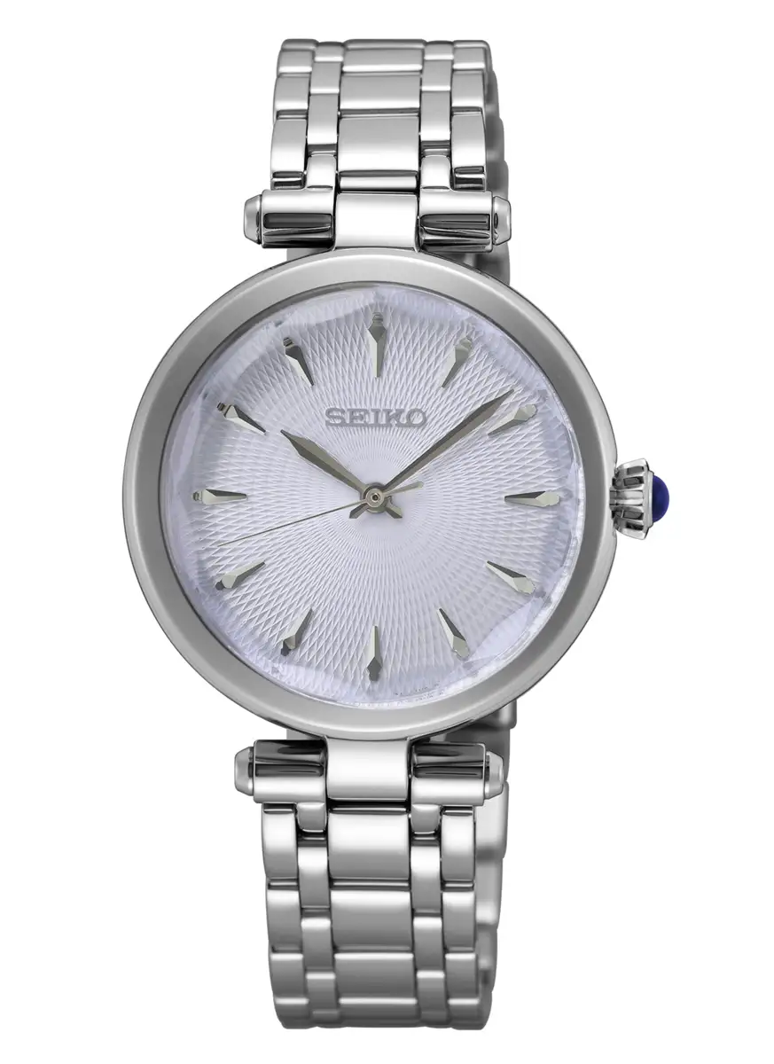 Seiko Classique SRZ553P1 zachwyca retro stylistyką, fasetowanym szkłem Hardlex i giloszowaną tarczą. Biżuteryjna bransoleta dodaje elegancji każdej stylizacji.