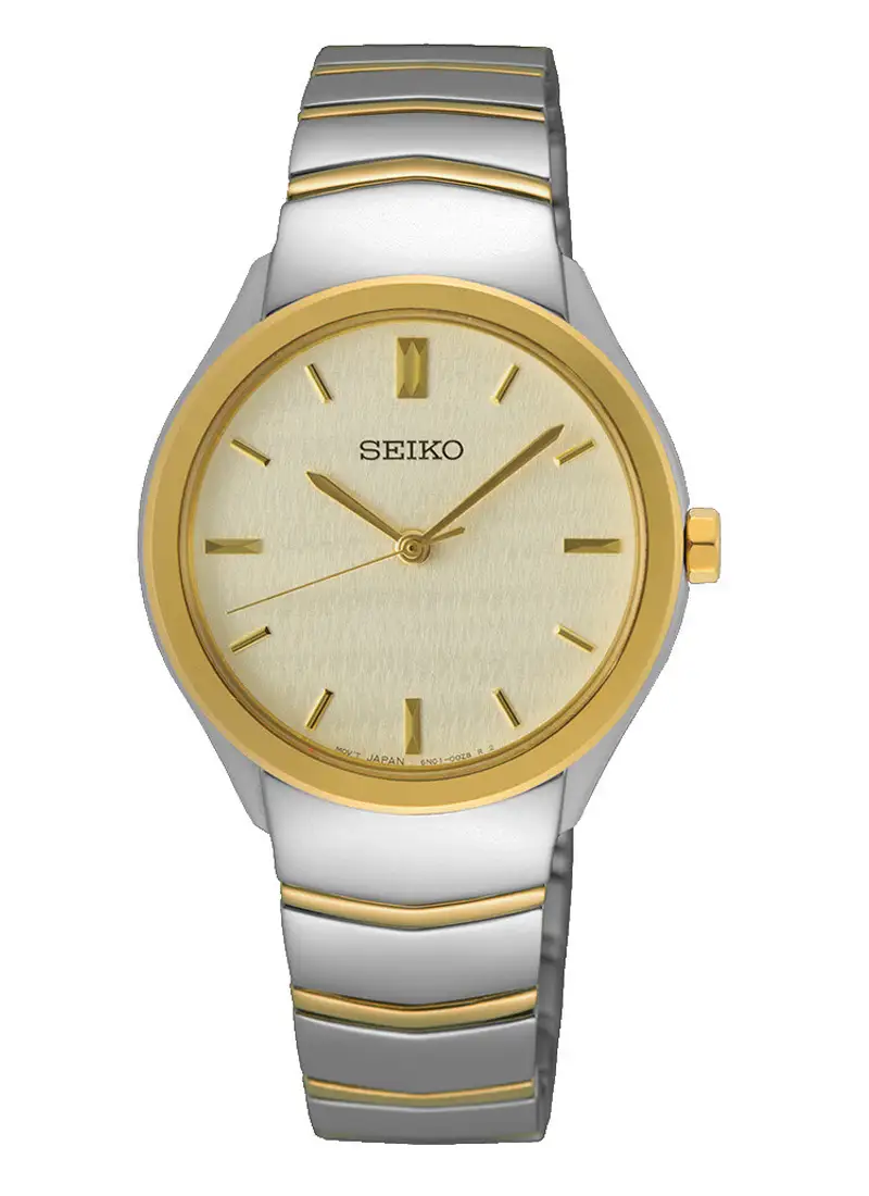 Seiko Conceptual SUR550P1 to damski zegarek stworzony dla miłośniczek elegancji w nowoczesnym, biżuteryjnym wydaniu. Jego minimalistyczna, złocona tarcza o szczotkowanej powierzchni subtelnie odbija światło, tworząc spokojny, harmonijny efekt. Model wyróżnia się również dwukolorową bransoletą o charakterystycznym układzie ogniw, w której matowe powierzchnie przeplatają się z polerowanymi akcentami, dodając całości wyrazistości.