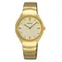 Okrągła koperta wykonana ze stali szlachetnej otoczona jest złoconym pierścieniem, dzięki czemu sylwetka zegarka nabiera ciepła i wyjątkowego uroku. Całość chroni odporne na uszkodzenia szkło Hardlex o delikatnym wygięciu, które nadaje tarczy głębię i optyczną miękkość. Zapięcie motylkowe zapewnia wygodę i stabilność, pozostając praktycznym na co dzień.