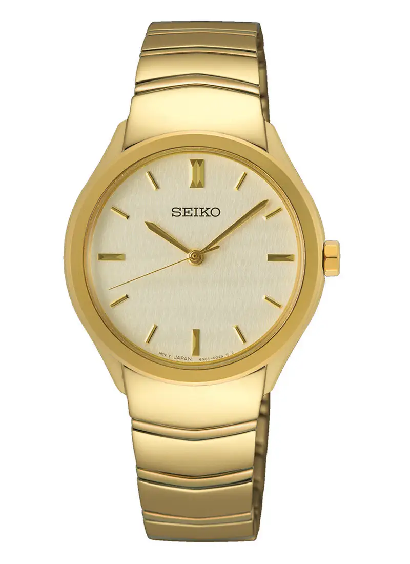 Seiko Conceptual SUR552P1 to damski zegarek w całości utrzymany w złotej tonacji, zaprojektowany z myślą o kobietach preferujących czystą elegancję oraz ponadczasową prostotę. Tarcza o delikatnym, pionowym szczotkowaniu tworzy naturalną grę światła, dzięki czemu model prezentuje się niezwykle subtelnie, jednocześnie zachowując wyrazisty charakter.