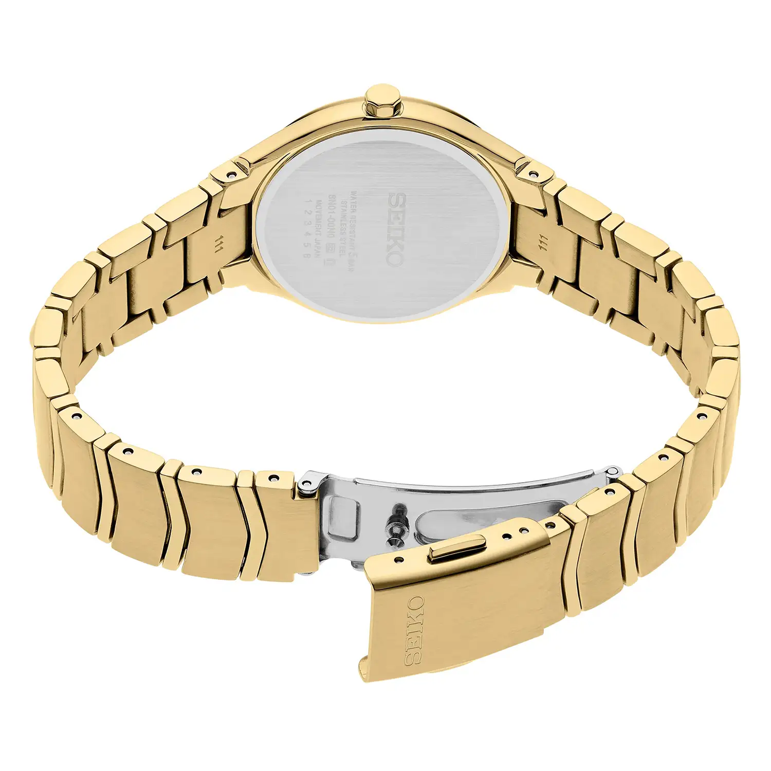 Koperta ma klasycznie okrągłą formę, a jej złocona powierzchnia została starannie wykończona, aby podkreślić biżuteryjny styl zegarka. Całość chroni lekko wygięte szkło Hardlex, nadające tarczy miękkiego efektu i delikatnej głębi. Bransoleta utrzymana jest w tej samej złotej kolorystyce — matowe powierzchnie przeplatają się tu z polerowanymi sekcjami, co nadaje konstrukcji rytmu i elegancji. Zapięcie motylkowe oferuje wygodę codziennego użytkowania.