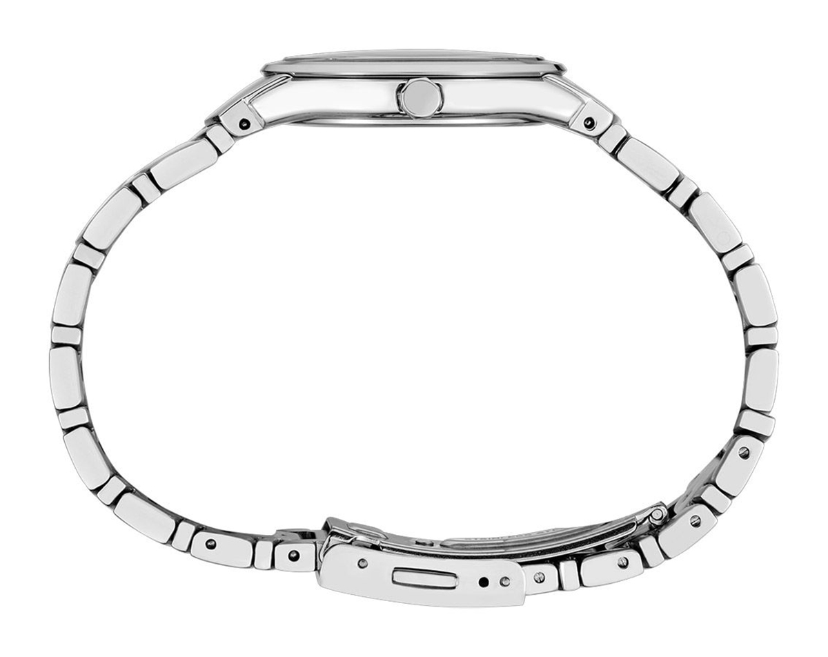 Koperta utrzymana w sześciokątnym, lekko kanciastym kształcie nadaje zegarkowi wyrazistości, zachowując przy tym wyjątkową lekkość wizualną. Stal szlachetna poddana szczotkowaniu została przełamana subtelnymi polerowanymi akcentami, co podkreśla architektoniczny sznyt projektu. Zintegrowana bransoleta płynnie przechodzi w kopertę, a jej charakterystyczny rytm ogniw tworzy elegancki układ matowych i błyszczących powierzchni. Wygodne, motylkowe zapięcie na przyciski zapewnia pewne i komfortowe użytkowanie.