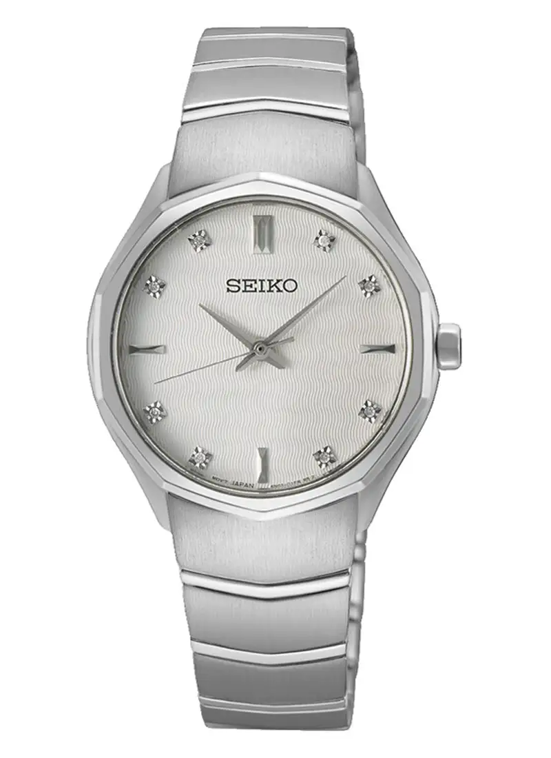 Elegancki zegarek damski Seiko Conceptual SUR615P1 wyróżnia się nowoczesnym charakterem, w którym geometryczne linie koperty spotykają się z biżuteryjną subtelnością tarczy. Srebrzysta powierzchnia ozdobiona falującym, drobnym giloszem tworzy delikatny efekt głębi, a osiem diamentów rozmieszczonych na jej obwodzie dodaje całości świetlistego blasku. Model ten łączy czystość formy z wyrafinowaniem, idealnie odpowiadając oczekiwaniom kobiet ceniących elegancję w codziennym wydaniu.
