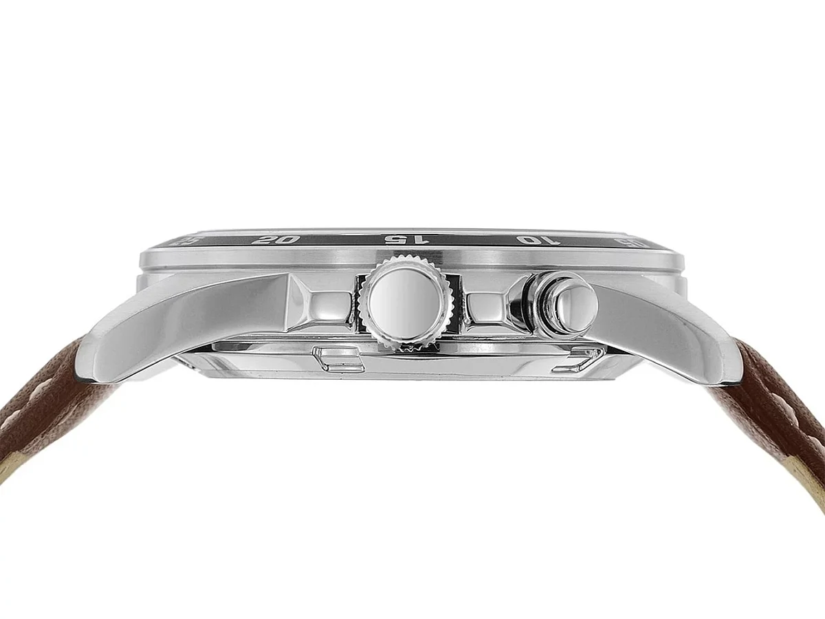 Stalowa koperta o średnicy 42,6 mm nadaje całości solidnego charakteru, a wodoszczelność do 10 bar pozwala swobodnie korzystać z zegarka w codziennych sytuacjach, również w kontakcie z wodą. Tarcza jest czytelna dzięki datownikowi oraz dużym, wyraźnym indeksom pokrytym LumiBrite, zapewniającym widoczność po zmroku. Utwardzone szkło Hardlex zwiększa odporność na zarysowania, a miękki, skórzany pasek gwarantuje komfort noszenia.