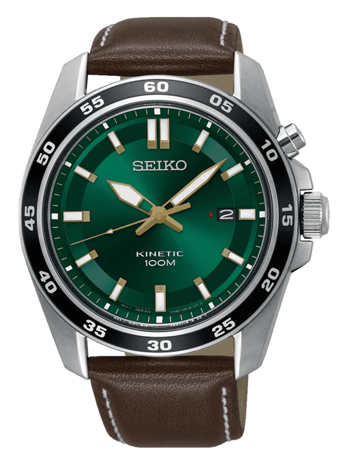Seiko Kinetic SKA791P1 z technologią Kinetic, zapewniając długą pracę bez wymiany baterii. Zielona tarcza, brązowy pasek i solidna, wodoodporna koperta tworzą sportowy i funkcjonalny zegarek. Czytelność po zmroku zapewnia LumiBrite.