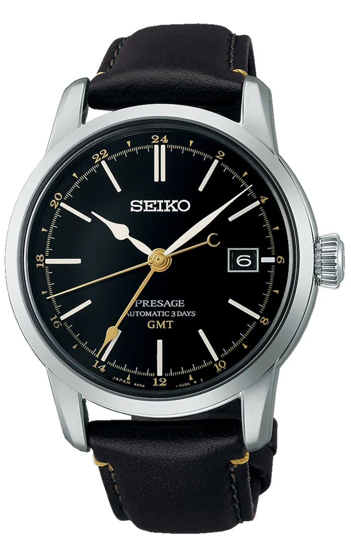 Subtelne, złocone wskazówki sekundowa oraz smukła GMT biegnąca do samej krawędzi cyferblatu gwarantują doskonałą czytelność i elegancki balans formy. Wskazania godzin, minut w kolorze białym dla lepszego kontrastu, rozmieszczono z typową dla Seiko symetrią, a złote akcenty cyferblatu nadają kompozycji ciepła i klasy. Całość uzupełnia brązowy pasek ze skóry cielęcej z dekoracyjnym przeszyciem w kolorze złotym. Skóra ta pochodzi z certyfikowanych źródeł Leather Working Group, co podkreśla dbałość marki o zrównoważoną produkcję i jakość materiałów.