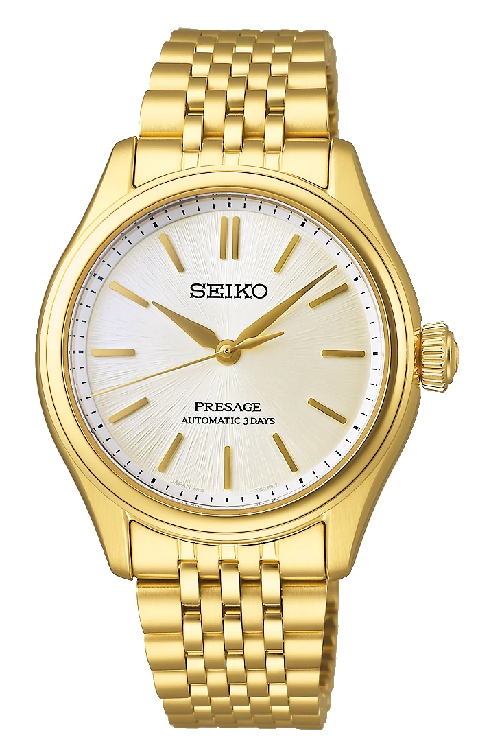 Seiko Presage Automatic Classic Series SPB524J1 to subtelny zegarek w złoconej kopercie, łączący klasyczną elegancję z japońskim rzemiosłem i nowoczesną precyzją mechaniki. Jego harmonijny design oraz kompaktowy rozmiar 36 mm sprawiają, że doskonale prezentuje się zarówno na męskim, szczupłym nadgarstku, jak i jako większy zegarek damski. To ponadczasowy model, w którym styl vintage spotyka się z nowoczesną technologią.