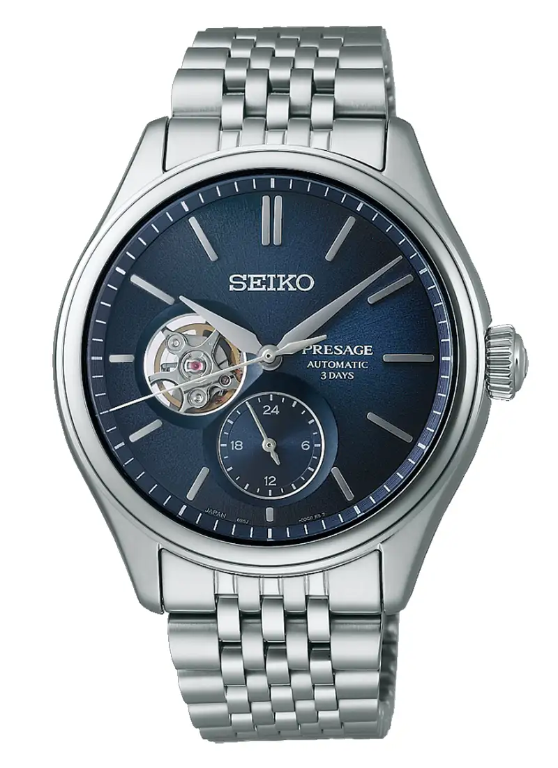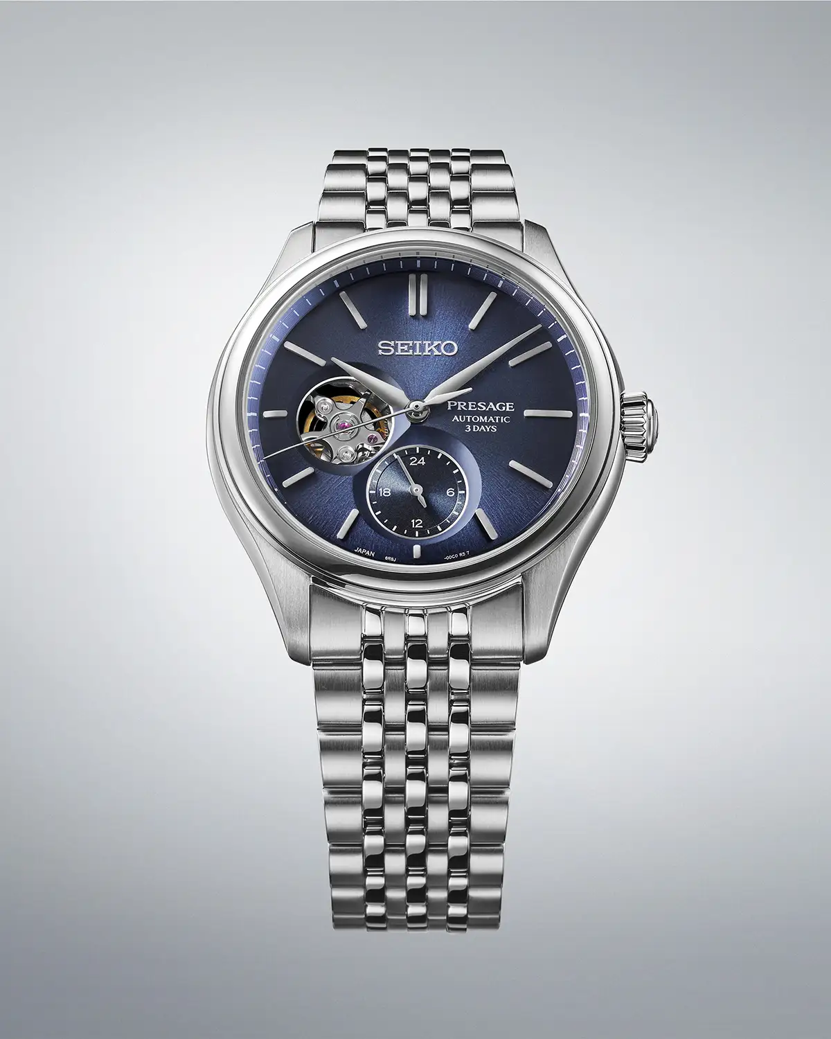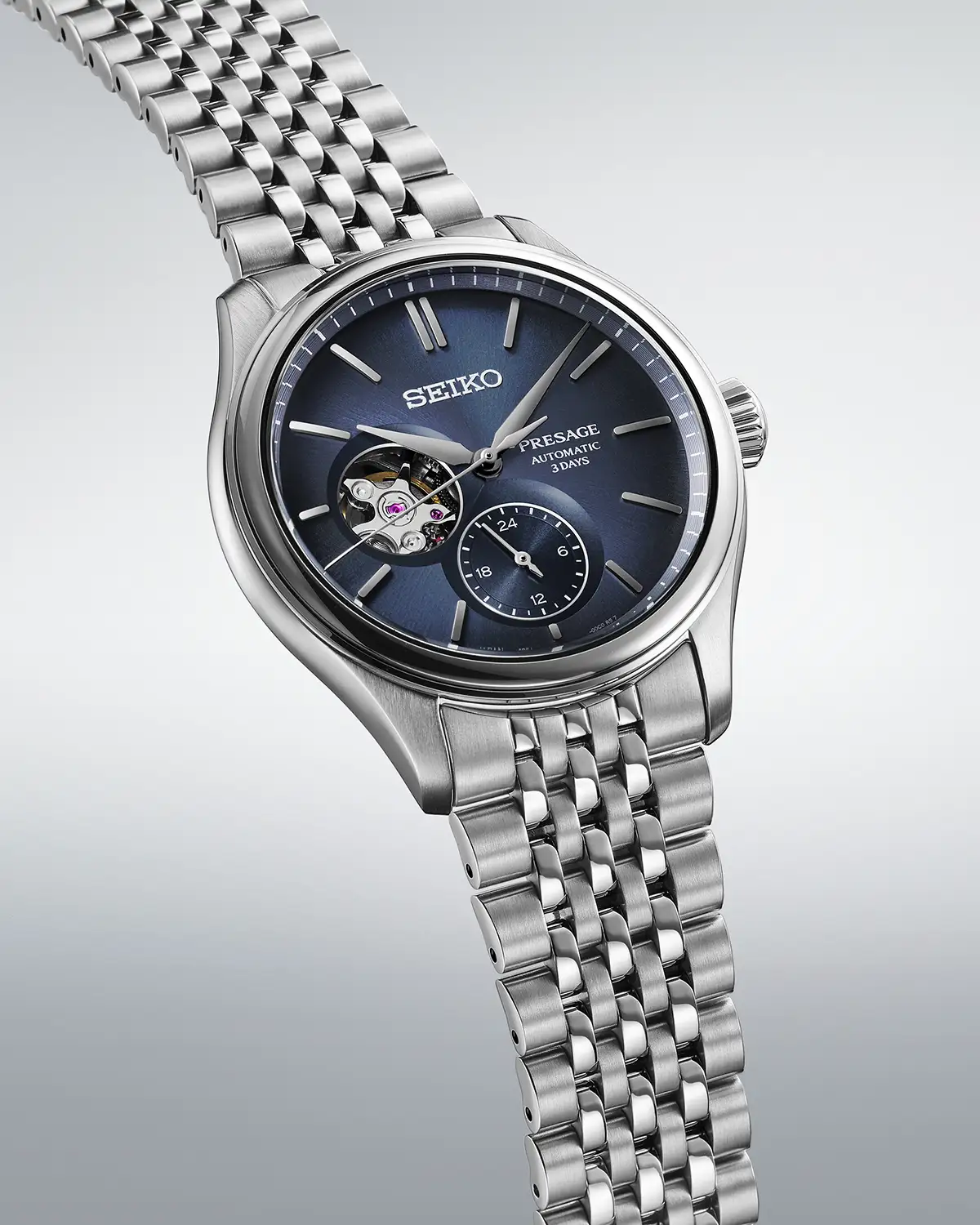 Seiko Presage SPB527J1 to elegancki zegarek męski z niebieską tarczą Ai-iro i widocznym balansem open heart. Model wyróżnia doskonała jakość wykonania, mechanizm automatyczny 6R5J oraz szafirowe szkło z antyrefleksem.