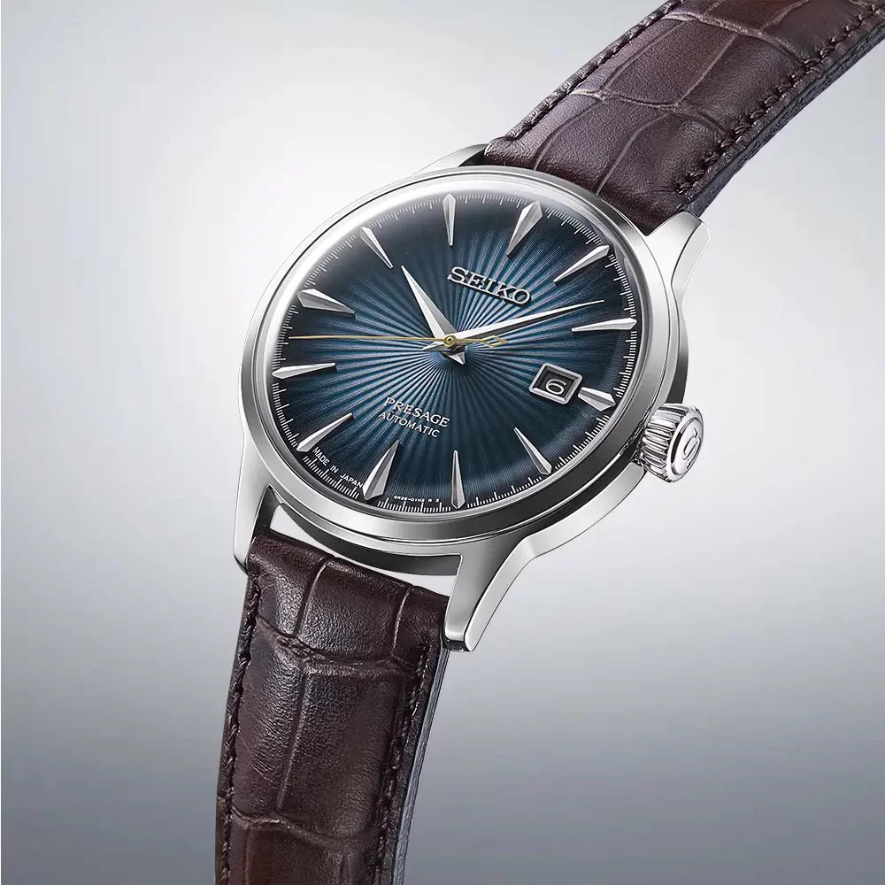 41-milimetrową kopertę uformowano ze szlachetnej stali nierdzewnej, której głównymi atrybutami jest elegancki wygląd, wytrzymałość i trwałość. Model ten zestawiony jest z eleganckim skórzanym paskiem w kolorze brązowym. Pasek wyposażony jest w zapięcie motylkowe na zatrzask najczęściej spotykane w stalowych bransoletach. Cała obudowa będzie więc stale chroniona przed korozją, utratą połysku i zarysowaniami. Seiko Presage Cocktail poświęcony jest Panom z wysmakowanym gustem co do stylu i jakości.