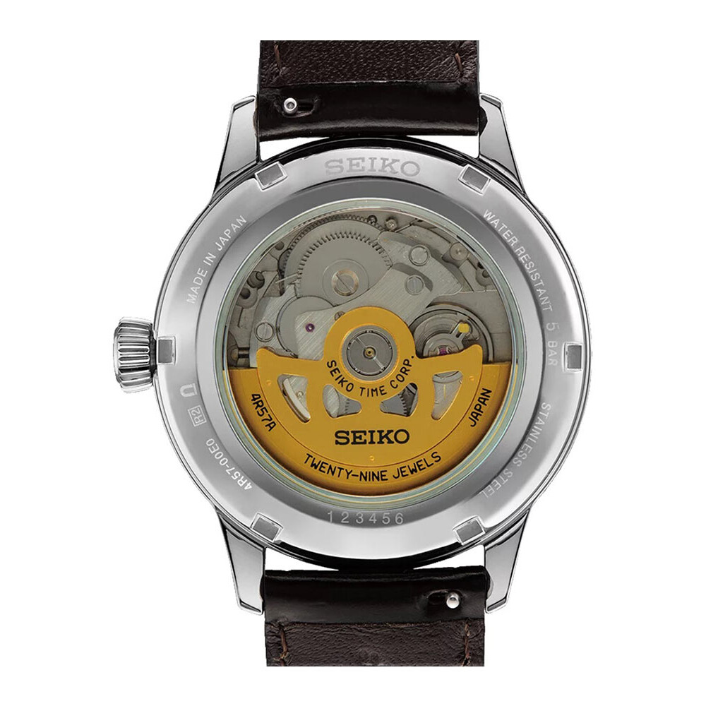 40.50-milimetrową kopertę uformowano ze szlachetnej stali nierdzewnej, której głównymi atrybutami jest elegancki wygląd, wytrzymałość i trwałość. Model ten zestawiony jest z eleganckim skórzanym paskiem w kolorze brązowym. Pasek wyposażony jest w zapięcie motylkowe na zatrzask najczęściej spotykane w stalowych bransoletach. Cała obudowa będzie więc stale chroniona przed korozją, utratą połysku i zarysowaniami. Seiko Presage Cocktail poświęcony jest Panom z wysmakowanym gustem co do stylu i jakości.