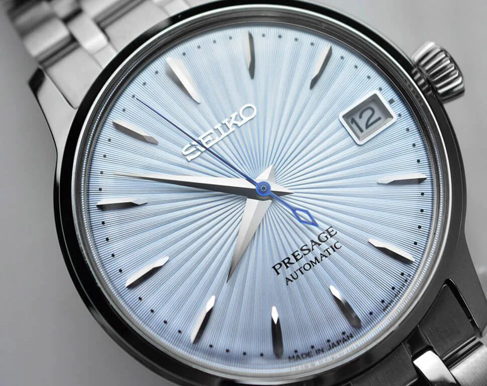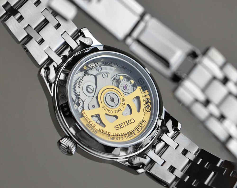 Polerowana na wysoki połysk nierdzewna koperta, stalowe indeksy godzin w postaci grotu strzał, cylindryczny kształt koronki ułatwiający ustawianie wskazówek, piękna, promienista tarcza przykryta utwardzanym szkłem sferycznym, bezpieczne zapięcie motylkowe bransolety na dwa przyciski, czy wreszcie przezroczysty spód zegarka, przez który możemy podziwiać pracę nowoczesnego mechanizmu automatycznego, zwieńczonego efektownym wahnikiem w kolorze żółtego złota. To elementy budzące zachwyt i szacunek do japońskiej sztuki zegarmistrzowskiej, w której na każdym kroku można dostrzec pasję i piękno będące natchnieniem rzemieślników kraju kwitnącej wiśni. Świetna propozycja dla eleganckich Pań, które szukają prestiżowego dodatku w celu dopełniania wizerunku. Taki zegarek to nie tylko efektowna i praktyczna ozdoba, ale także element damskiej biżuterii, symbol statusu społecznego i dojrzałego gustu.