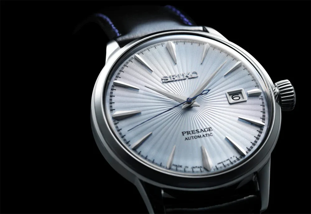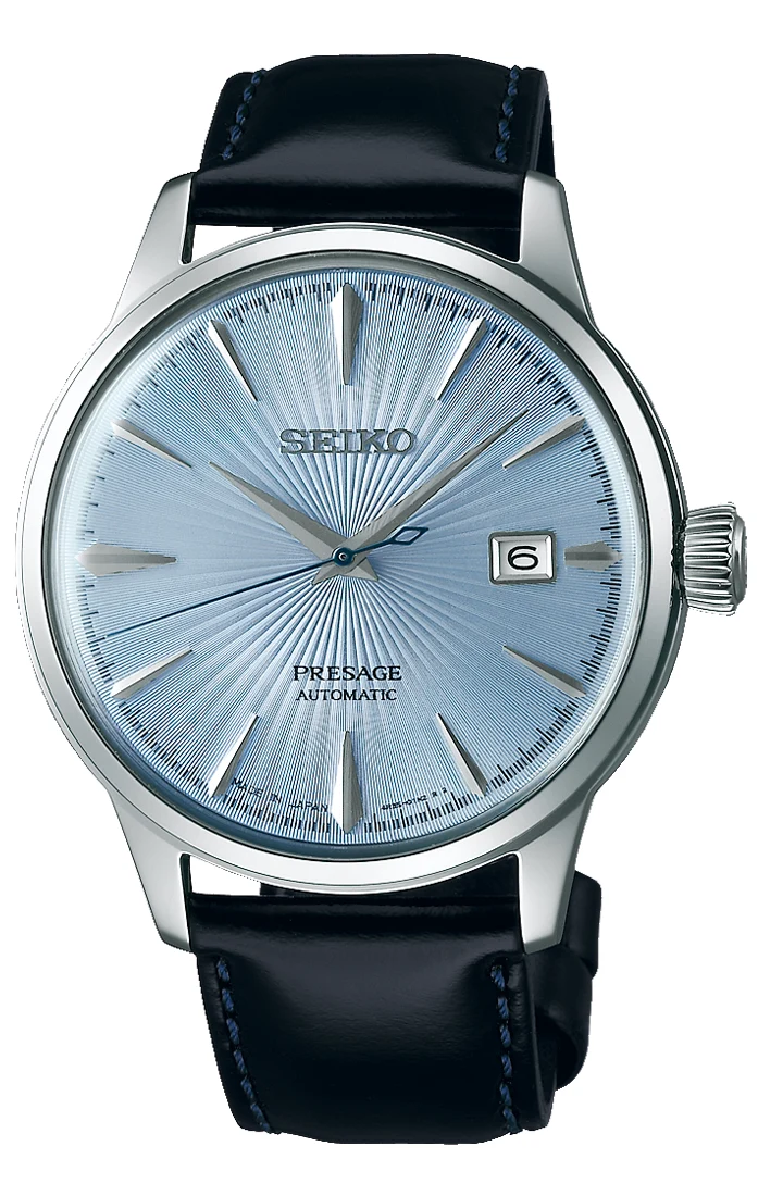 Seiko Presage SRPB43J1 Skydiving – elegancki zegarek z błękitną tarczą inspirowaną koktajlem, na skórzanym pasku. Styl, harmonia i japońska precyzja.