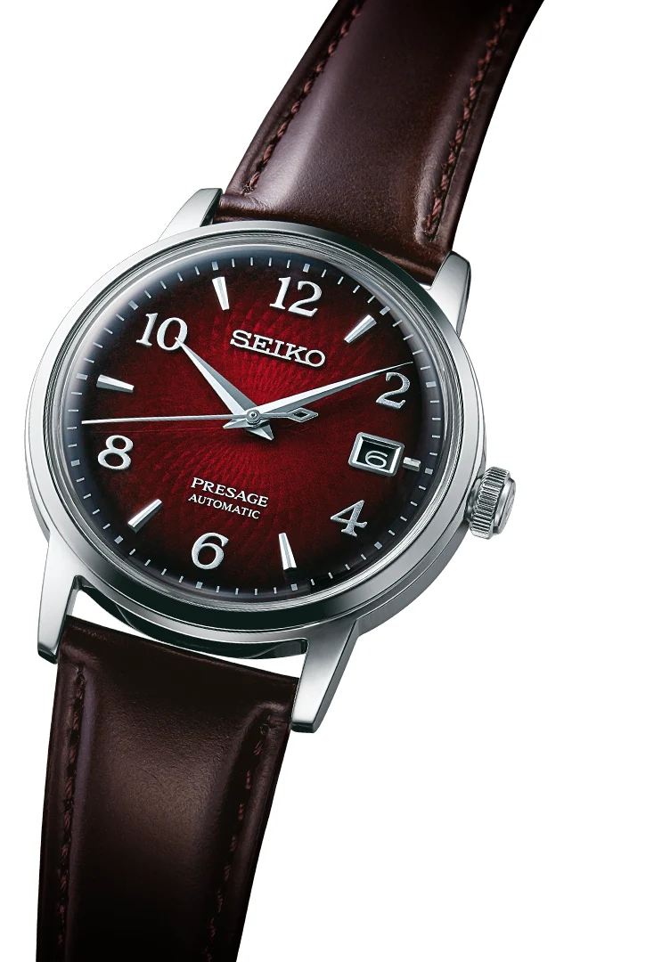 Pod zakrzywionym szkłem Hardlex typu box-shape rozciąga się zachwycająca tarcza o gradiencie w kolorze negroni – od intensywnego burgundu w centrum po ciepły odcień miedzi przy krawędziach. Powierzchnia cyferblatu ozdobiona została subtelnym, promienistym wzorem o delikatnej fakturze, który nawiązuje do refleksów światła w szkle koktajlowym. Nakładane indeksy i logo SEIKO w kolorze srebrnym odbijają światło z niezwykłą elegancją, podkreślając trójwymiarowy charakter tarczy. Smukłe wskazówki i mały datownik na godzinie trzeciej dopełniają klasyczną kompozycję.