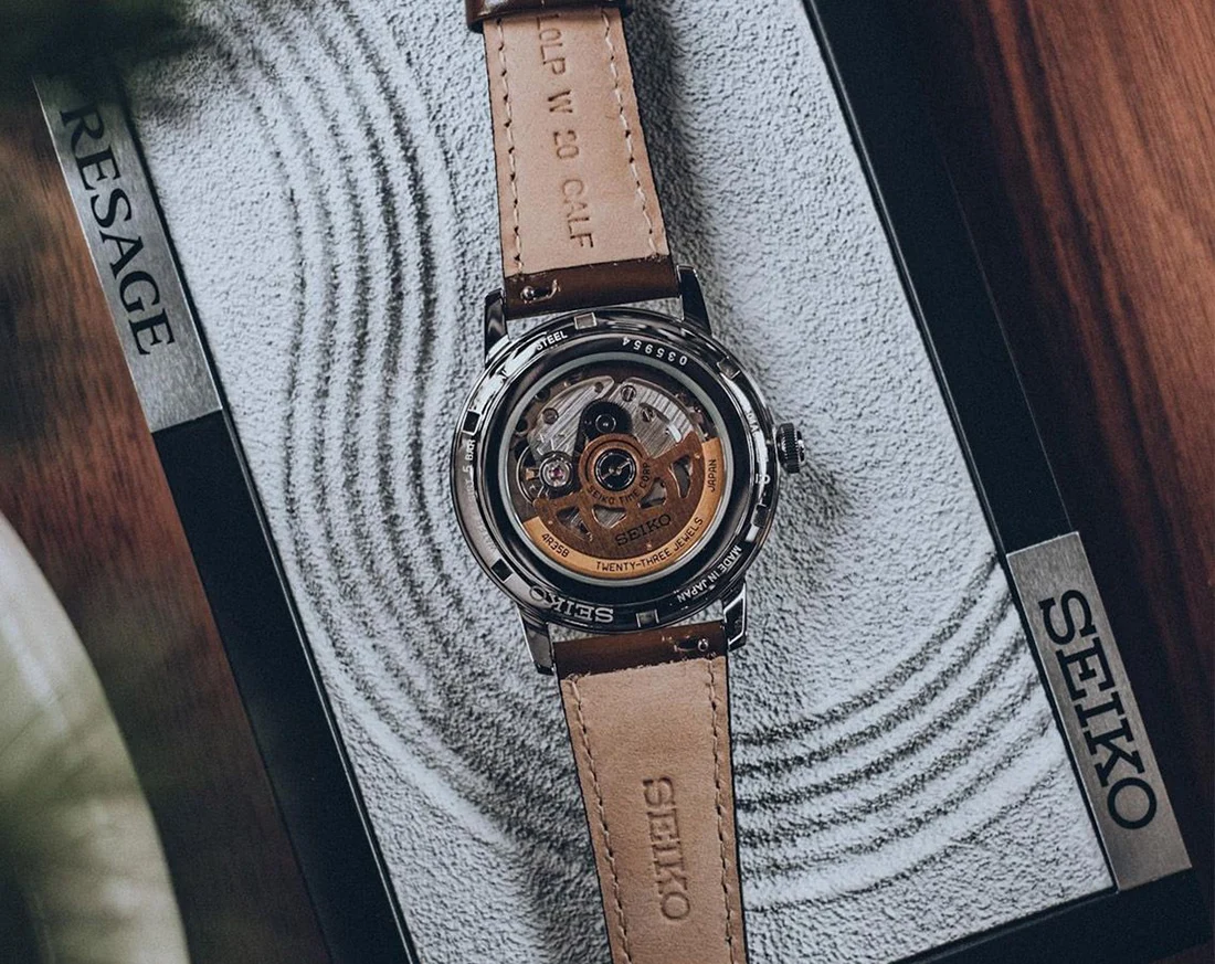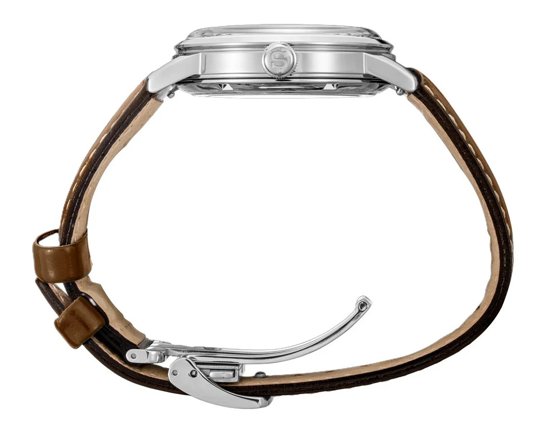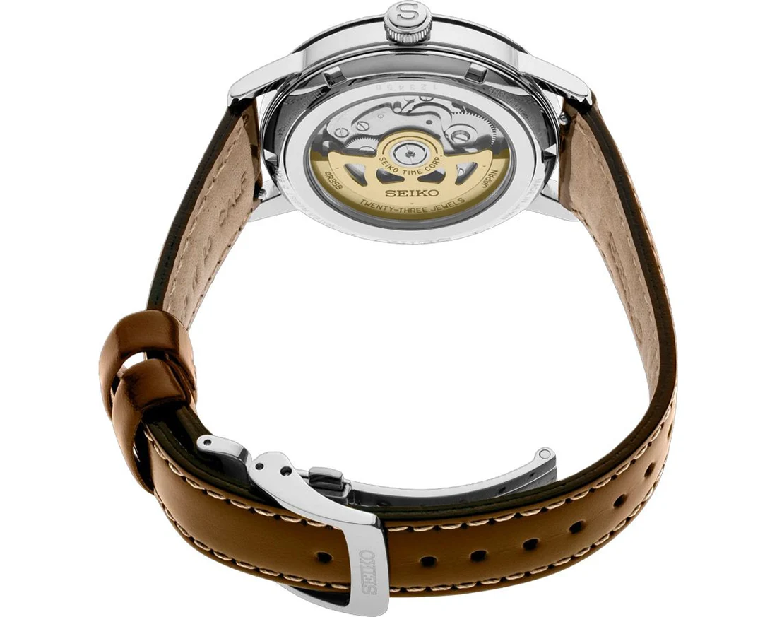 Koperta o średnicy 38,5 mm wykonana została ze stali szlachetnej i zestawiona z brązowym paskiem ze skóry naturalnej o delikatnym połysku, zakończonym zapięciem motylkowym. Przez przeszklony, zakręcany dekiel można podziwiać pracę mechanizmu automatycznego Seiko 4R35 z rezerwą chodu do 41 godzin. Wodoszczelność do 5 barów zapewnia bezpieczeństwo w codziennym użytkowaniu.