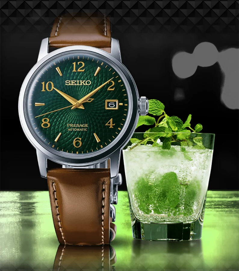 Seiko Presage Cocktail Time SRPE45J1, znany również jako Seiko Presage Mojito, to zegarek, który łączy w sobie finezję japońskiego rzemiosła z radosnym charakterem koktajlu, od którego zaczerpnął inspirację. Zielona tarcza przywodzi na myśl orzeźwiające połączenie mięty, limonki i lodu – klasyczny Mojito w zegarmistrzowskiej formie.