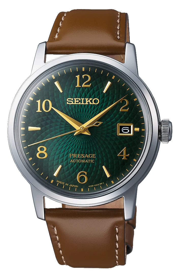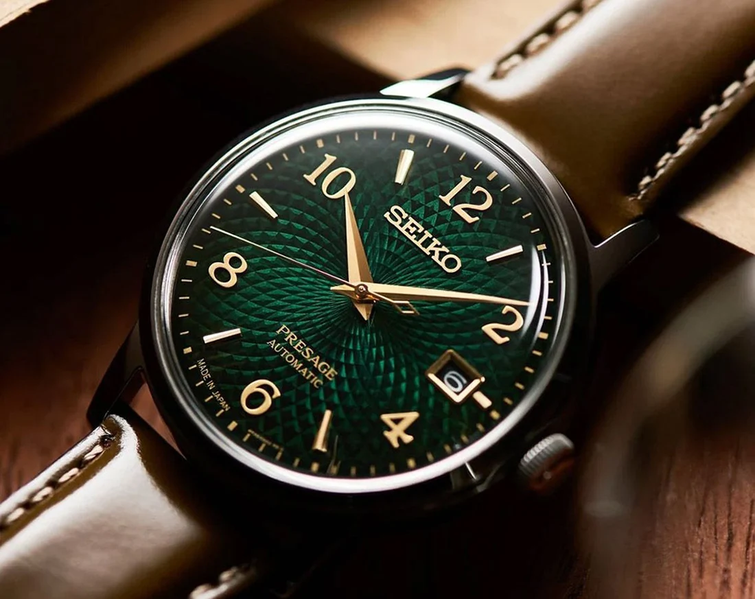 Pod delikatnie wypukłym szkłem Hardlex typu box-shape kryje się misternie wykonana tarcza o głębokiej, zielonej barwie z efektownym geometrycznym wzorem, który przypomina refleksy światła odbijające się od kryształowego szkła koktajlowego. Złote indeksy, cyfry arabskie i logo SEIKO kontrastują z ciemną zielenią tła, tworząc elegancką, harmonijną całość. Na godzinie trzeciej umieszczono subtelny datownik, a smukłe wskazówki w złotym tonie dodają kompozycji wyrafinowania.
