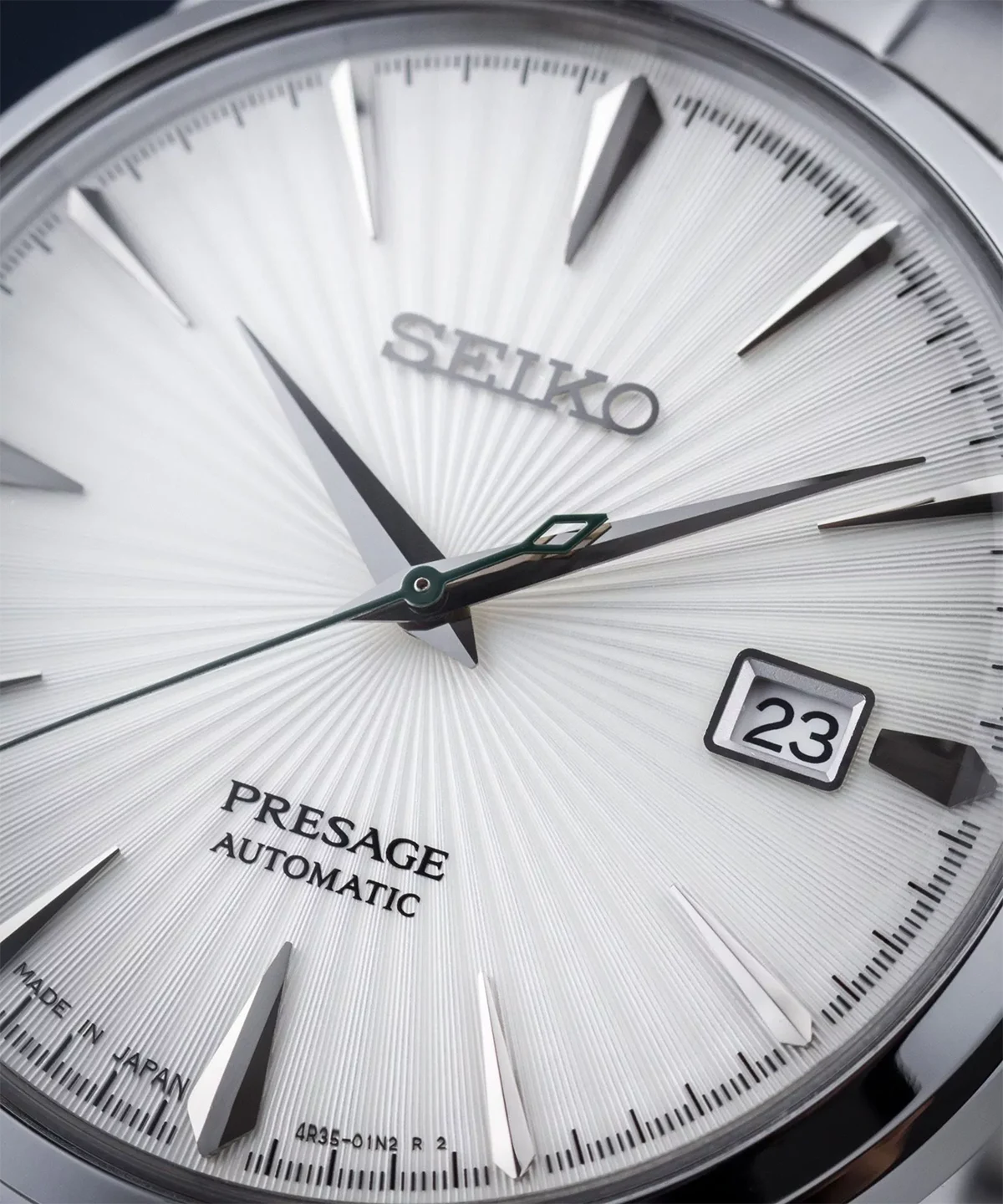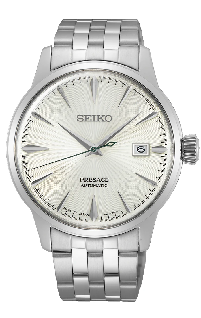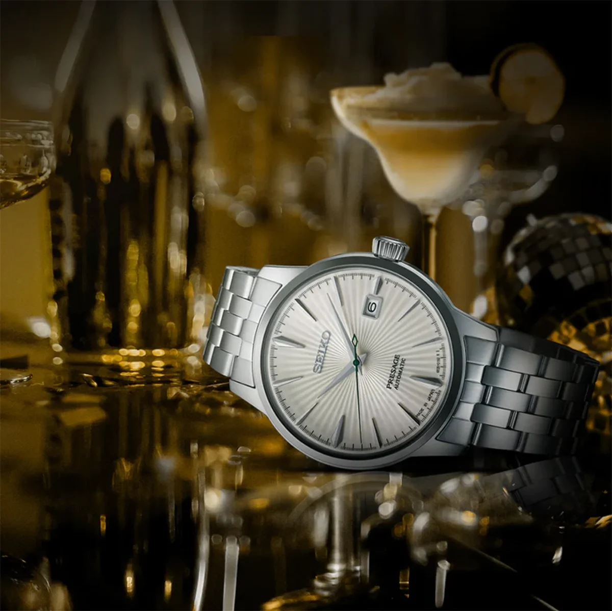 Seiko Presage SRPG23J1 The Martini – klasyczny zegarek z perłową tarczą inspirowany kultowym koktajlem. Subtelny styl i mechanizm 4R35 w perfekcyjnej formie.