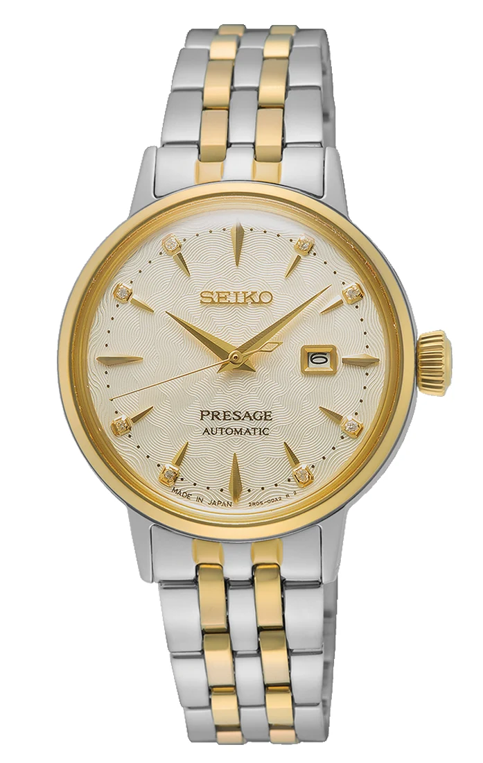 Seiko Presage SRE010J1 White Lady Diamond Twist złoto-srebrna bransoleta, 8 diamentów i automatyczny mechanizm 2R05 w eleganckiej formie.