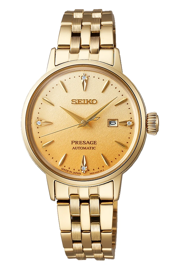 Seiko Presage Diamond Cocktail Time SRE018J1, znany również jako Eggnog, to luksusowy damski zegarek inspirowany świątecznym koktajlem o tej samej nazwie. Ciepła, złocista tonacja modelu odzwierciedla kremową barwę klasycznego Eggnogu – napoju, który symbolizuje przyjemność i elegancję w najlepszym japońskim wydaniu.