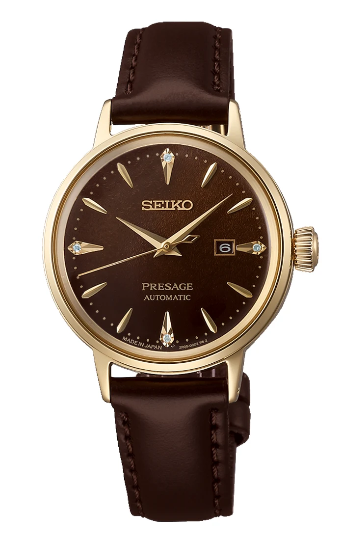 Seiko Presage SRE020J1 Jamaican Coffee brązowa tarcza z diamentami, złota koperta i skórzany pasek z mechanizmem automatycznym 2R05.
