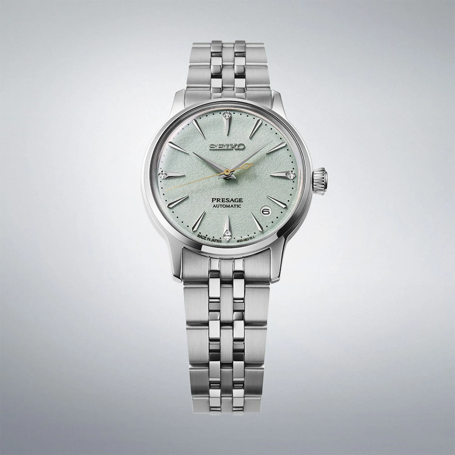 Seiko Presage Diamond Cocktail Time SRPL63J1, znany również jako Frozen Mojito, to elegancki damski zegarek inspirowany świeżością klasycznego koktajlu mojito. Jego delikatnie miętowa tarcza odzwierciedla kolor napoju, symbolizując lekkość, harmonię i orzeźwienie – wartości typowe dla japońskiej estetyki oraz kultury tworzenia koktajli w tokijskim Star Bar.