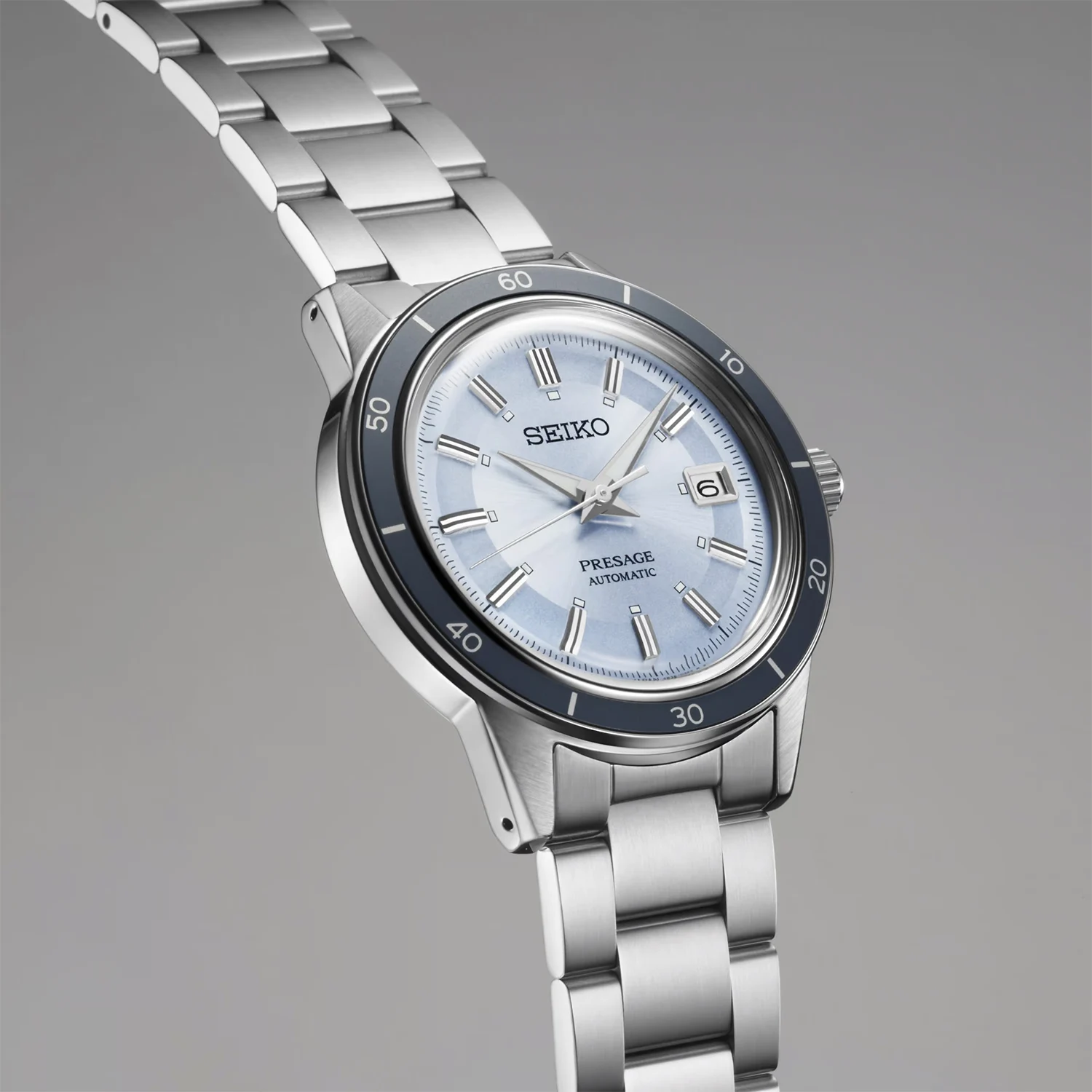 Koperta o średnicy 40,8 mm wykonana jest ze stali szlachetnej, a jej smukła konstrukcja nawiązuje do legendarnych modeli Seiko Crown Chronograph. Aluminiowy bezel w odcieniu granatu harmonizuje z błękitną tarczą, tworząc subtelny, elegancki efekt retro inspirowany europejskim stylem wnętrz i designu z połowy XX wieku. Delikatne indeksy i wskazówki wypełnione masą LumiBrite zapewniają doskonałą czytelność w każdych warunkach.