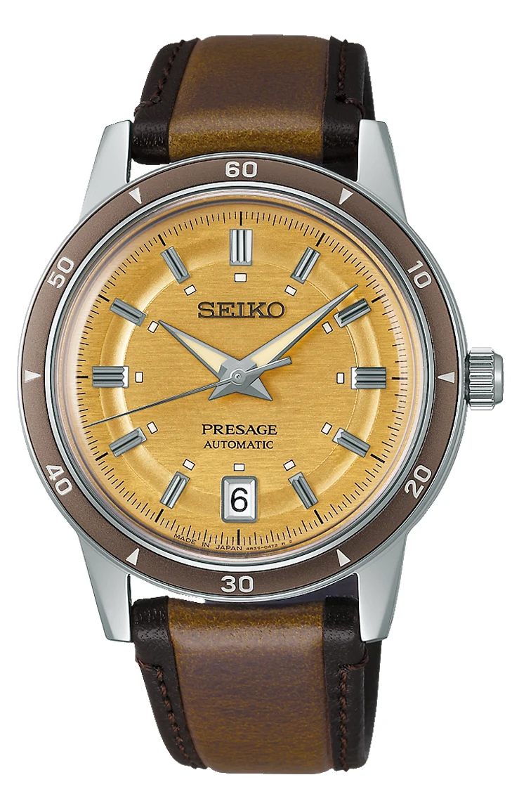 Seiko Presage SRPL75J1 to automatyczny zegarek w stylu retro z miodową tarczą i brązowym paskiem skórzanym. Styl lat 60. w nowoczesnej odsłonie.