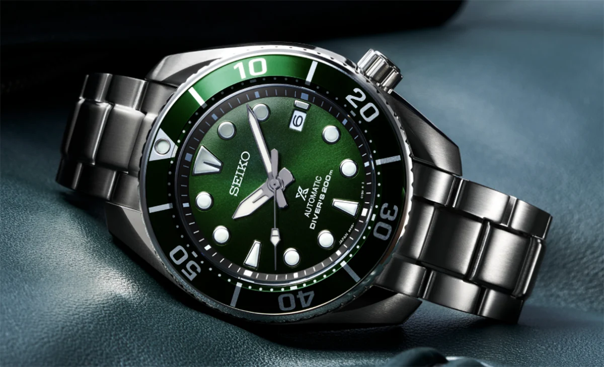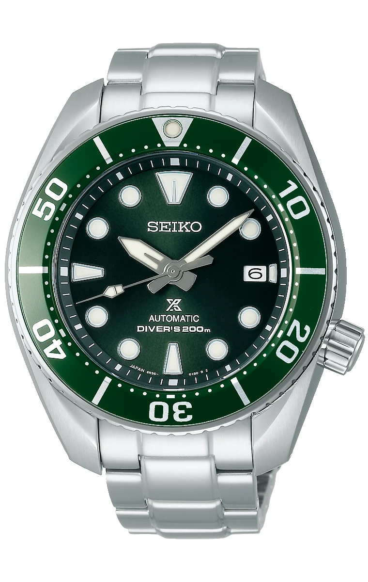 Seiko Sumo SPB103J1 to męski zegarek nurkowy o wodoszczelności 200 m. Zielona tarcza, stalowa koperta i mechanizm automatyczny czynią go idealnym zegarkiem do pływania i codziennego użytku.